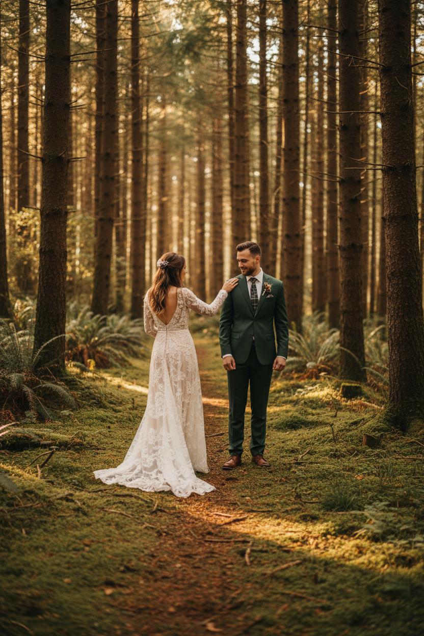 If your heart beats a little faster when the wind moves through tall pines, make the forest your gallery and let the trees frame your day. For a mountain wedding, plan a first look on a mossy path where filtered light paints everything soft and romantic, then wander to an overlook for those sweeping portraits with the peaks in the background, bouquets catching the breeze. For a woodland wedding, think intimate clearings and fern-lined trails; hang a few brass lanterns from low branches or set them on stumps to create a magical glow at dusk, and weave a faux cedar garland around a trailhead sign for a subtle nod to your story together. The result is a cozy wedding that feels like a secret shared with the forest—quiet, cinematic, and full of that pine-scented hush.