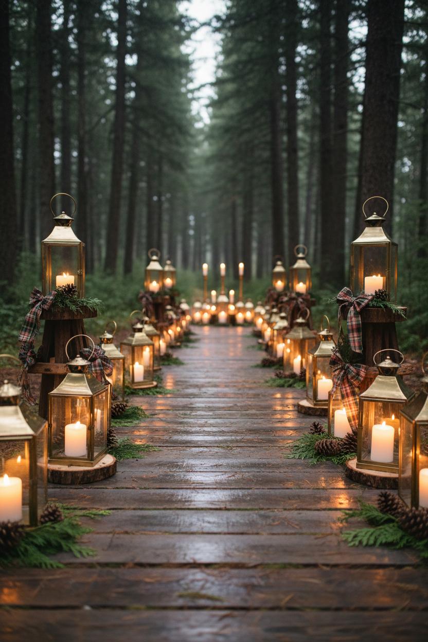 There’s just something about brass lanterns that makes a mountain wedding feel instantly magical. Line the aisle with them in staggered heights, their warm glow dancing across pine needles and weathered floorboards, and you’ve got the kind of cozy wedding ambiance that guests will remember long after the last sparkler fades. Nestle lanterns on small rounds of wood, scatter a few pinecones or sprigs of cedar at the base, and tie a ribbon in plaid to nod to cabin wedding decor without trying too hard. If your ceremony is outdoors, cluster lanterns at the entrance and the altar, then let the light trail down the aisle like breadcrumbs through the trees for a woodland wedding moment. Consider mixing in safe LED pillars for longer burn time, then add a few real tapers to bring that authentic flicker. The brass finish plays beautifully with winter greens, autumn leaves, or summer wildflowers—truly seasonless rustic wedding ideas.