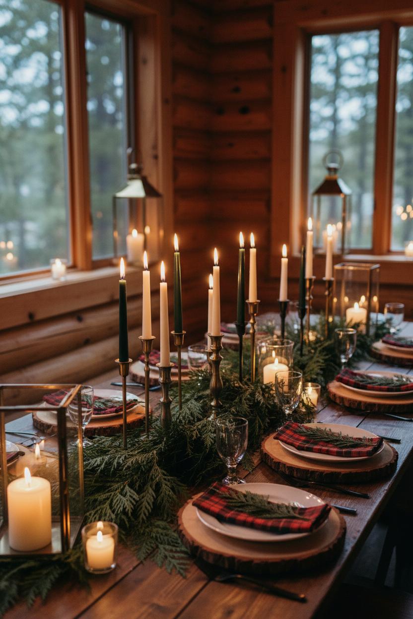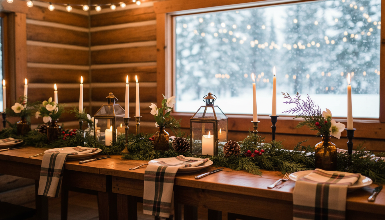 For guest tables, start with wood slice chargers to set a rustic foundation, then center a brass lantern on a bed of evergreen sprigs or a simple linen runner. Flank the lantern with slender taper candle holders for extra height and a bit of drama, and finish each place setting with plaid napkins for that fireside charm. You can scatter tiny votives for dimension, or tuck in berries and dried grasses to lean into the season. The mix of brass, wood, and greenery feels upscale yet unfussy—a recipe for a cozy wedding that balances elegance with nature’s ease, and a shining example of woodland wedding and mountain wedding style done right.