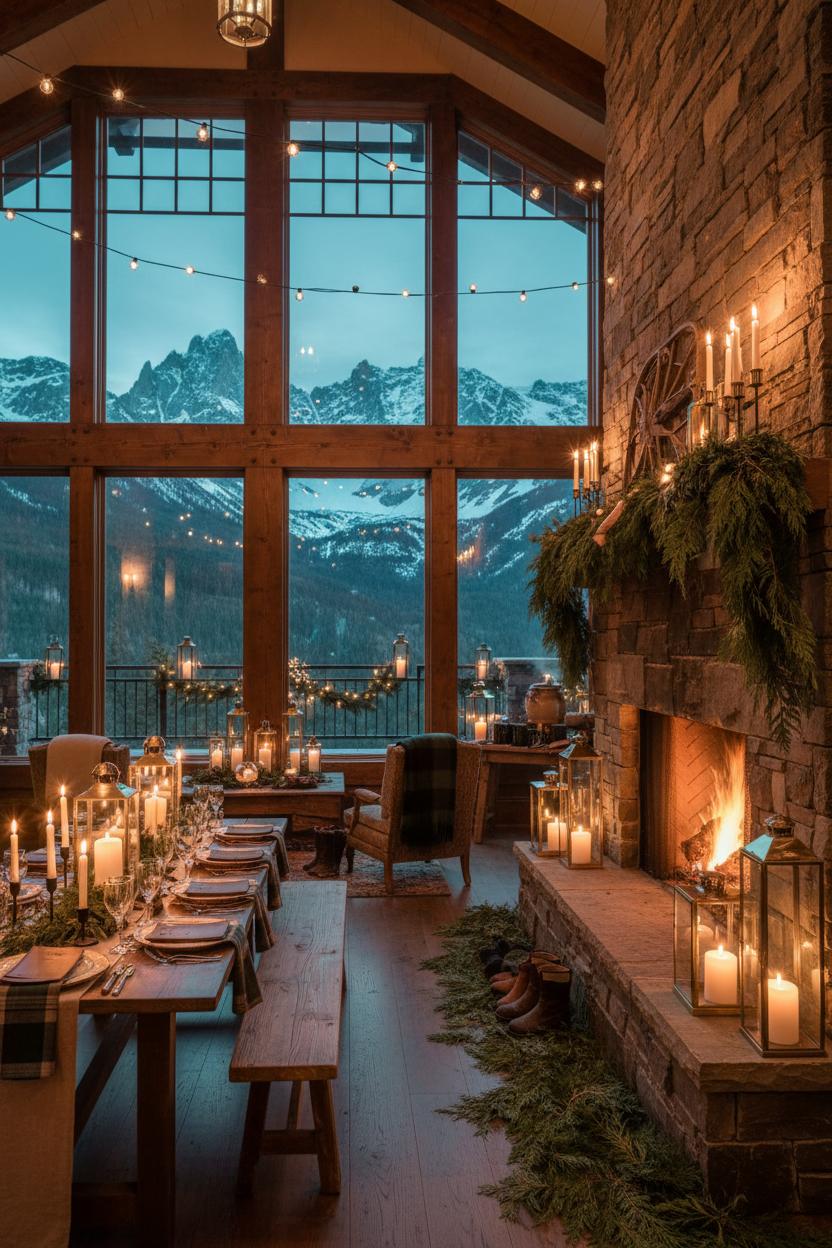 Picture your guests stepping into a lodge where the mountains feel close enough to touch, boots crunching on cedar needles as the glow of firelight spills from a massive stone hearth. This is the heart of a mountain wedding—where your cabin wedding decor leans into the flicker and the granite, and everything feels touched by alpine air. Layer in textures that echo the landscape: a cascade of faux cedar garland across the mantle, clusters of brass lanterns lining the aisle and porch steps, and slim taper candle holders marching along the hearth ledge to amplify that cozy wedding shimmer. Let the skyline be your backdrop through wide windows, then echo those blues and greens inside with woven throws, plaid napkins, and wild-foraged accents. A few well-placed evergreen sprigs, pinecones, and leather-bound menus nod to woodland wedding charm without feeling theme-y—just effortless, lived-in warmth that whispers welcome.
