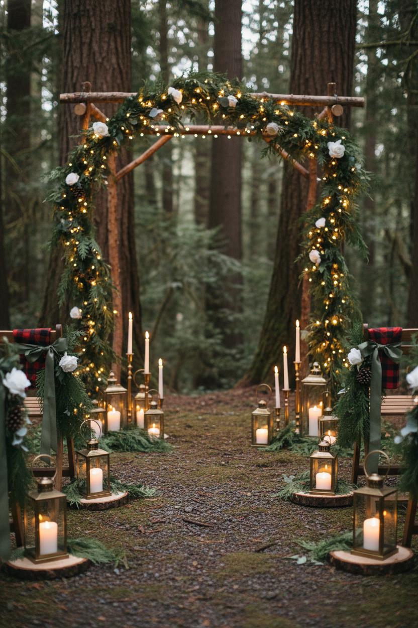 There’s something undeniably romantic about saying “I do” in front of a backdrop that feels like it was borrowed from the forest. For a woodland wedding, faux cedar garland is the secret ingredient that makes everything look lush and effortless without the mess or maintenance of real greens. Drape two or three strands over a simple wooden arch and let them tumble organically, then weave in fairy lights for that twinkle-at-dusk glow. If your venue has a cabin porch or a stone fireplace, frame the space with garland swags and soft fabric, and suddenly you’ve got a ceremony nook that feels intimate and bespoke—pure cozy wedding magic. To ground the greenery, cluster brass lanterns at the base of the arch and tuck in a few taper candle holders in warm metallics for height and flicker. The effect is equal parts mountain wedding romance and polished cabin wedding decor, a balance of wild and refined that photographs beautifully from every angle.