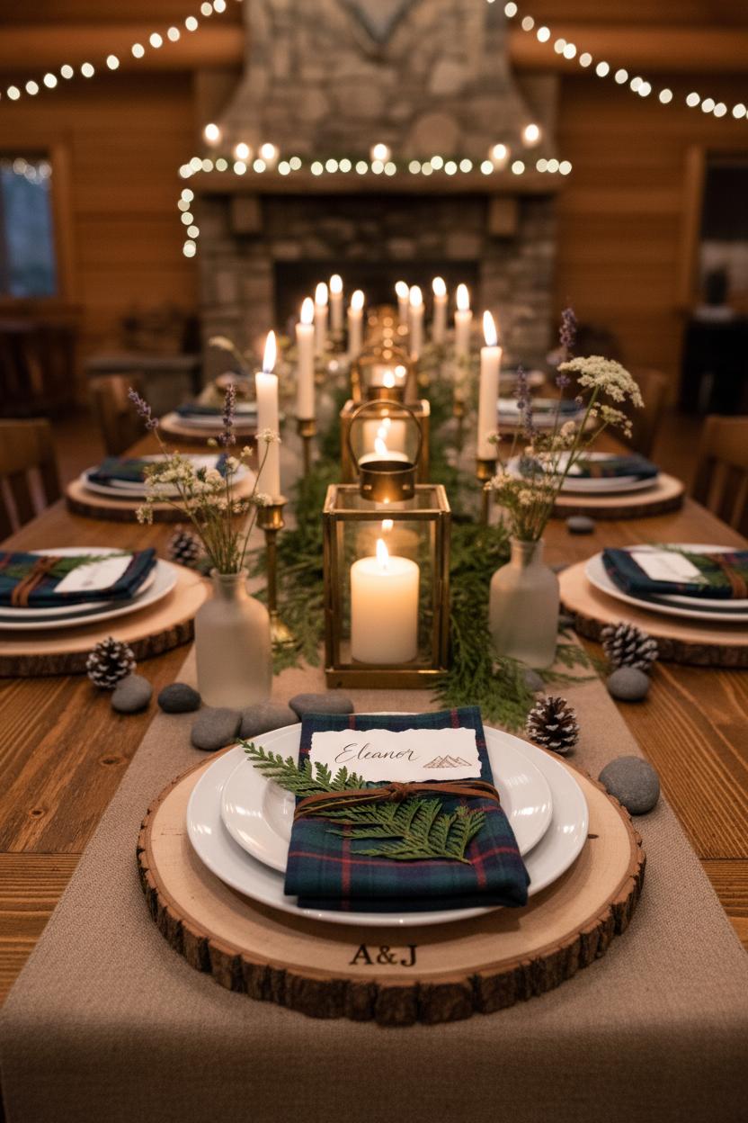 Set the tone for a cozy wedding dinner by layering textures you’d actually find in a snug cabin: think natural wood, soft wool, and warm metal. Start with a simple runner—linen or flannel both work—and anchor each setting with wood slice chargers that instantly whisper forest chic. Stack your plates and tuck in plaid napkins for a nod to lodge life; mix patterns in the same palette (navy, forest green, oxblood) so the table feels collected, not matchy. Handwrite guests’ names on wildflower place cards, and slip in a dried bloom or pressed fern for a sweet, keepsake detail that suits any woodland wedding. These small touches are the secret sauce of cabin wedding decor: tactile, unfussy, and brimming with personality. If you’re planning a mountain wedding, add a few smooth river stones or tiny pinecones around the plates to tie the tablescape back to the landscape.