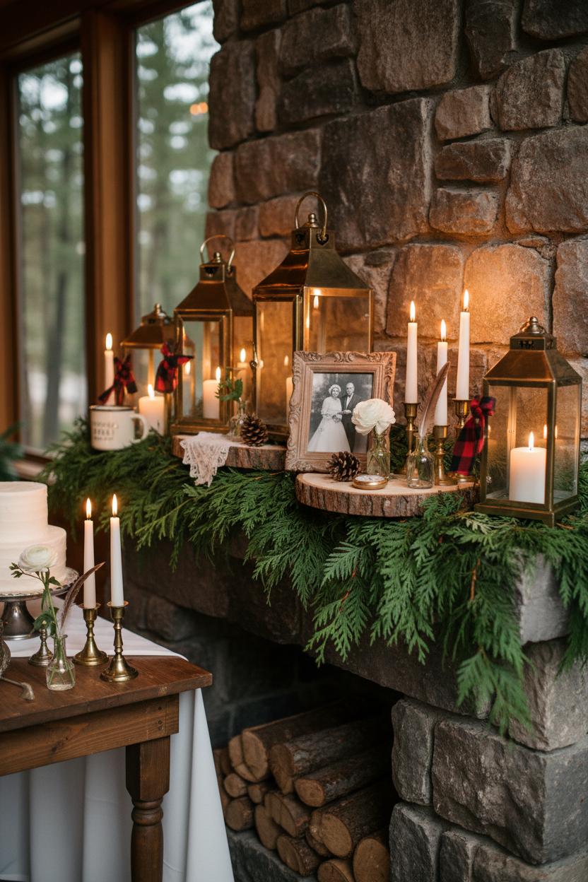 On the mantel, think lush and layered. Drape faux cedar garland along a stone fireplace, tucking brass lanterns right into the greenery, and let them glow at staggered heights like little hearth-side constellations. Slip in a handful of taper candle holders to add varying lines and that romantic, old-world feel. A few vintage books, a framed quote, or a wooden sign can make the whole vignette feel personal, but it’s the lantern light that softens the edges and makes the room hum with warmth. This is where cabin wedding decor really shines—texture on texture, glow on glow, and a backdrop perfect for photos when the fire is crackling and the night settles in.