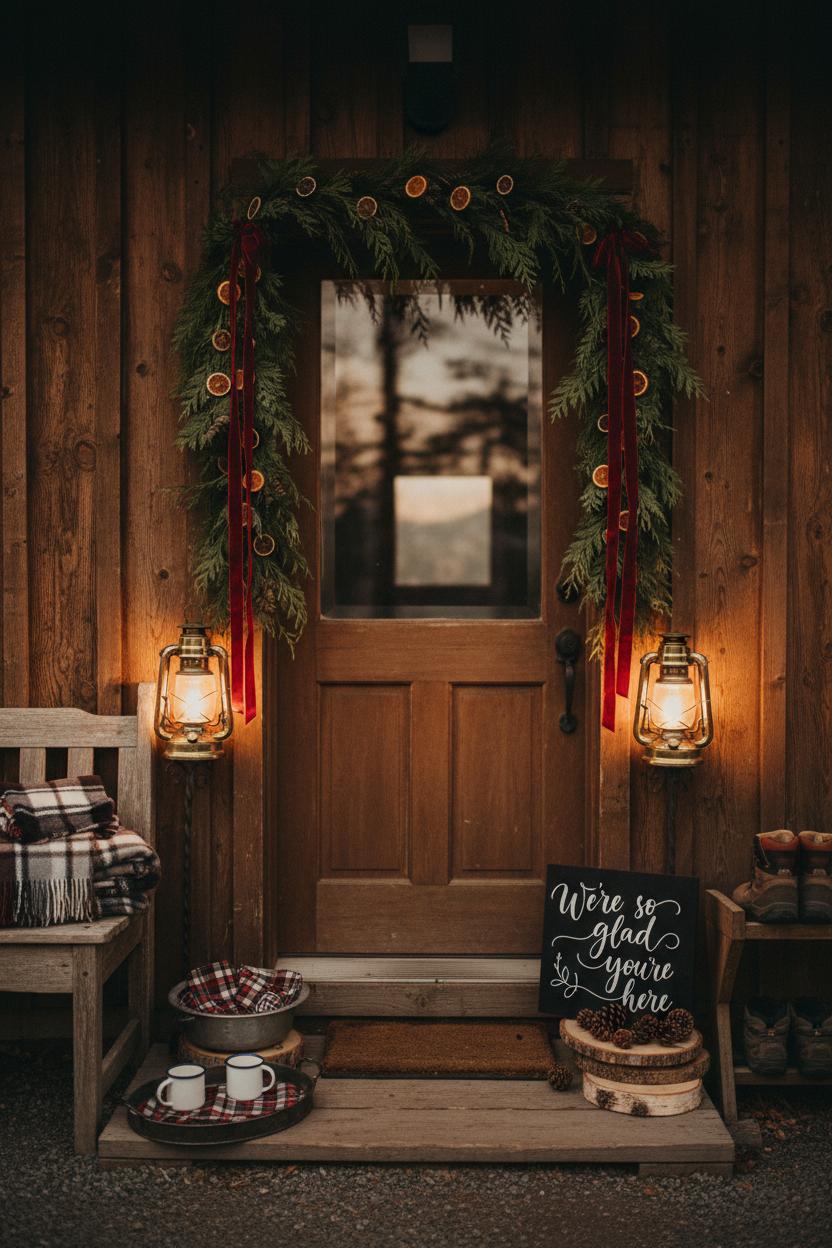 Set the tone the moment the cabin door swings open with an entry that feels like a hug. Frame the doorway in faux cedar garland and tuck in a few velvet ribbon tails or dried oranges for that nostalgic, woodsy perfume. A pair of brass lanterns on either side casts a golden welcome, especially for a mountain wedding where the evening light fades fast. Prop a hand-lettered “We’re so glad you’re here” on stacked wood slice chargers to create easy, rustic height, and sprinkle in pinecones and tiny birch rounds as accents. An old bench or boot rack becomes a styled landing zone: baskets of wool throws, a dish of hand warmers, and a petite welcome tray with cider in enamel mugs and plaid napkins folded like pocket squares. This is cabin wedding decor at its most inviting—layered, tactile, and perfectly imperfect—setting up a cozy wedding vibe before guests even check their coats.