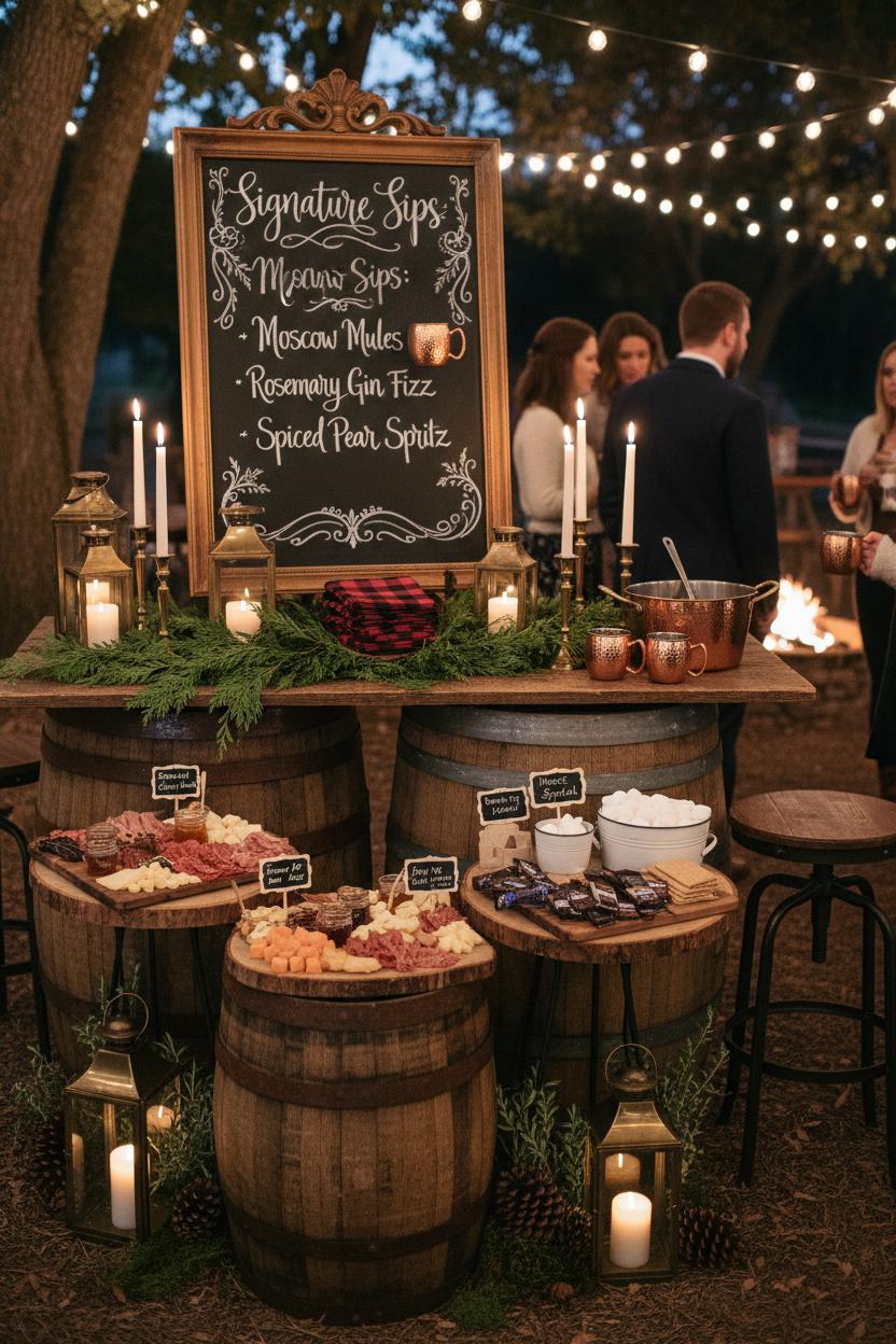 Lean into the season and your setting with playful touches that turn service into an experience. At a mountain wedding, a warm sips corner with mulled cider or hot toddies feels decadent in the best way, especially when guests cradle copper mugs under string lights and wander back to the fire. For a woodland wedding, tuck herbs and pinecones around the base of the barrels and scatter a few mossy accents so the whole scene looks foraged, not forced. If your vision skews cozy wedding, set a self-serve s’mores bar with marshmallows corralled in enamel tins and chocolate displayed on wood slice chargers; a chalkboard sign can outline the “house special” combo. Keep the flow easy with a narrow aisle between stations and a few high stools nearby for quick perches. Everything here is mix-and-match friendly—rent the big pieces, then layer in those small details you can keep, like brass lanterns, taper candle holders, plaid napkins, and a length of faux cedar garland for future holidays. The result is an unfussy, touchable bar scene that feels intimate, photogenic, and unmistakably you.