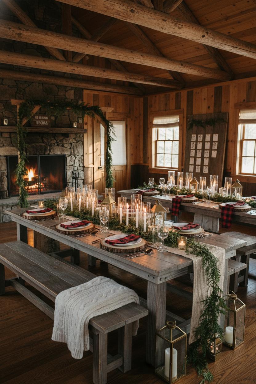 Texture is your secret sauce for creating that cozy wedding glow. Think natural linen napkins swapped for playful plaid napkins at each place setting, cable-knit throws on bench seating, woven runners, and maybe a hint of leather in your chair ties or escort display. Let natural light do the heavy lifting, keeping window treatments minimal so the golden hour pours in and kisses every surface. As dusk settles, layer in the romance: slim taper candle holders clustered at varied heights, a few low votives for sparkle, and lanterns to guide guests along pathways. The overall effect should feel like stepping into a woodland wedding daydream—earthy, inviting, and a little bit enchanted. Finish with greenery that feels plucked from the pines, weaving that faux cedar garland through centerpieces and around signage to blur the lines between indoors and out. With these foundations—warm woods, tactile layers, and a glow that shifts with the sun—you’ll capture cabin wedding decor that’s effortlessly intimate, perfectly at home in the mountains, and timeless enough to live on in your photos long after the last toast.