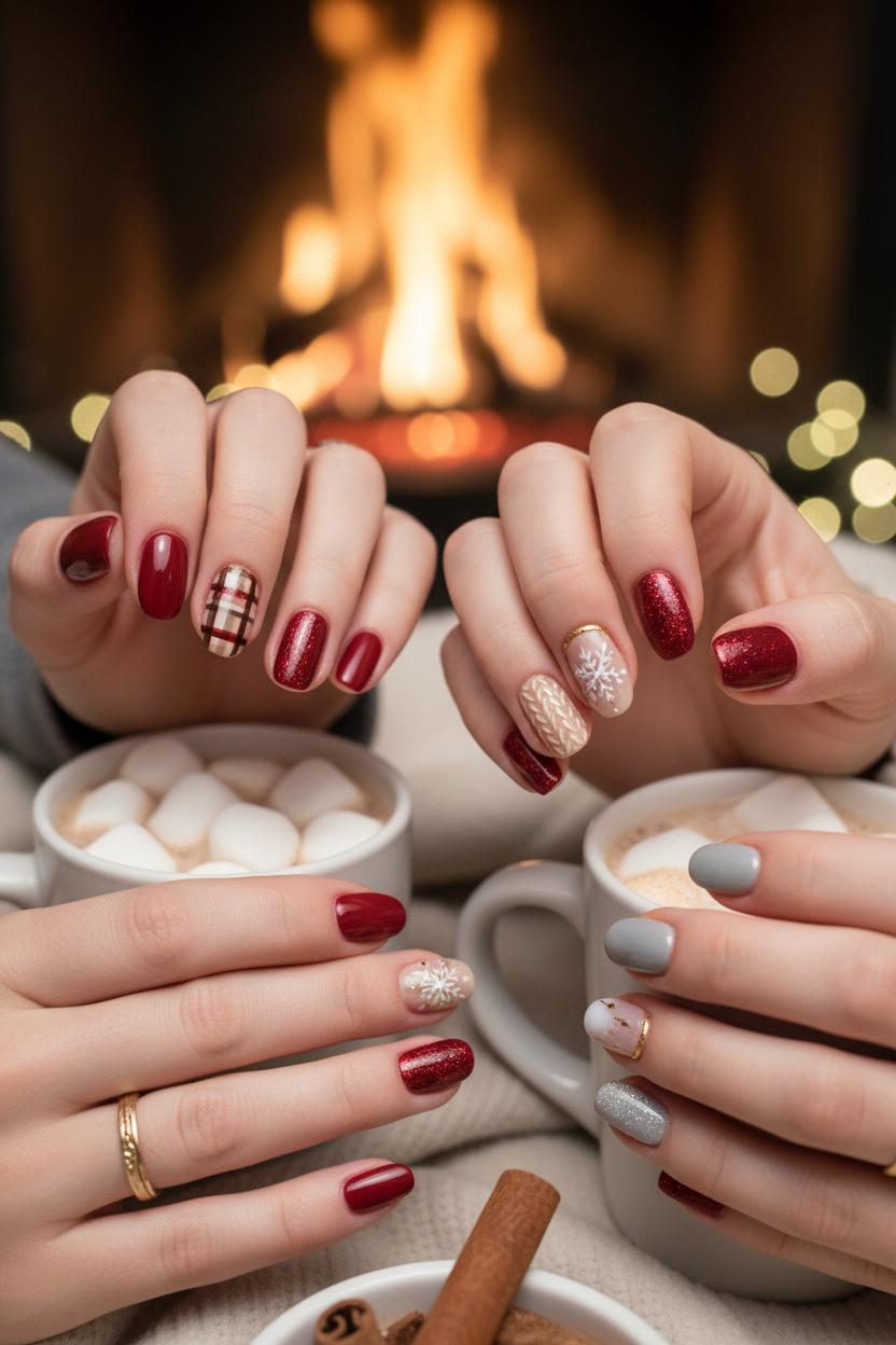 From classic crimson to gilded sparkle and delicate flakes, these cozy christmas nails bring all the fireside feels. Whether you love red glitter nails, gold accents, or snowflake nail art, use these holiday nail ideas to craft a winter manicure that’s merry, polished, and uniquely you. Pour cocoa, queue the carols, and pick your favorite combo: bold, minimal, or mix and match. Pin for later, share with your nail tech, and let your fingertips twinkle all season. Here’s to cozy moments, shining lights, and nails that glow as bright as your holiday spirit.