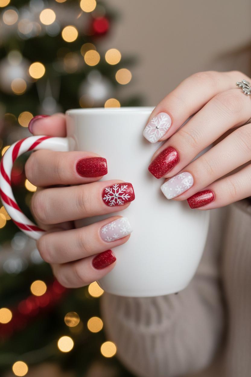 Play with placement to keep things interesting: two glitter-dipped thumbs, a snowflake ring finger, and a negative-space flurry on the middle finger feels editorial without trying too hard. Short, cozy lengths look chic with a micro-glitter finish, while almond or squoval shapes make those snowflakes look extra airy. A velvet matte top coat over the flake nails next to glossy red glitter nails gives that luxe, layered texture Pinterest dreams are made of. However you arrange it, this mix-and-match combo is equal parts merry and wearable—classic enough to carry you through the season, but special enough to make your holiday photos sparkle.