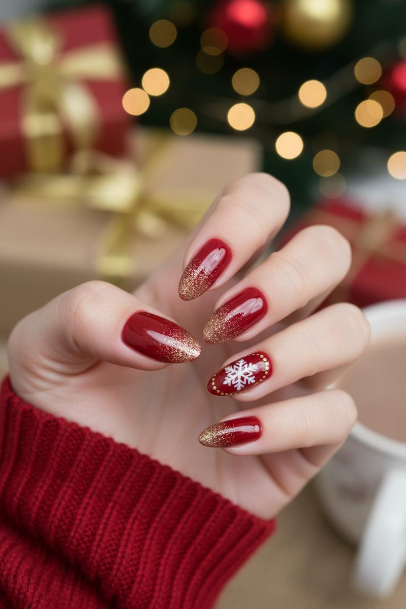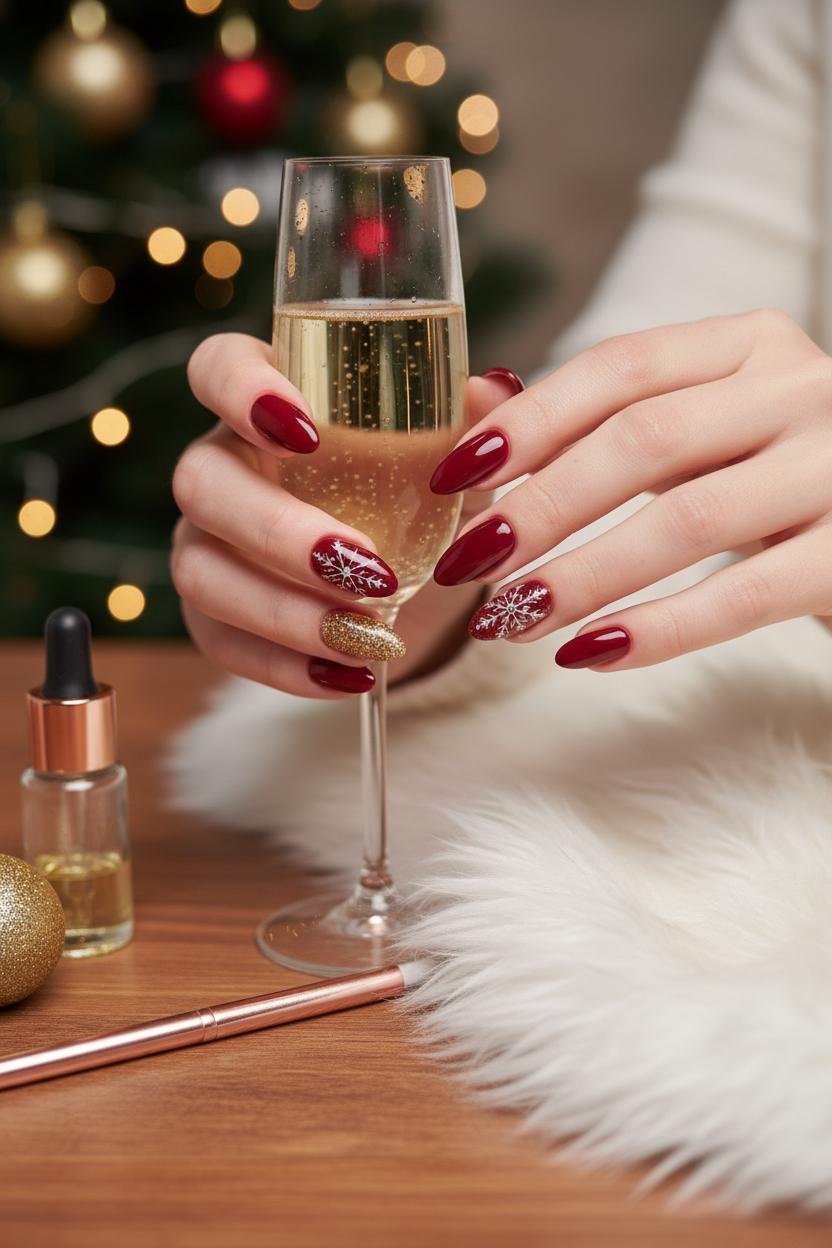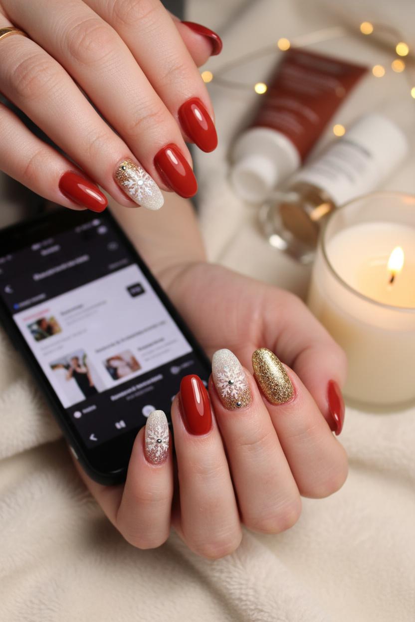 To keep everything soft and cohesive, play with texture. A matte red paired with glossy gold accents feels luxe, while a shiny red base with gold foil flakes leans festive and bright. Mix in a single negative-space snowflake, a gold French tip, or a glittery ombré for variety without visual clutter. This color story flatters short, neat nails and longer almond shapes alike, so it’s an easy wardrobe match from chunky sweaters to satin slip dresses. And when the season is sprinting by, a quick swipe of gold nail glitter over grown-out tips refreshes your look in minutes—proof that cozy can be effortless and still sparkle just right.