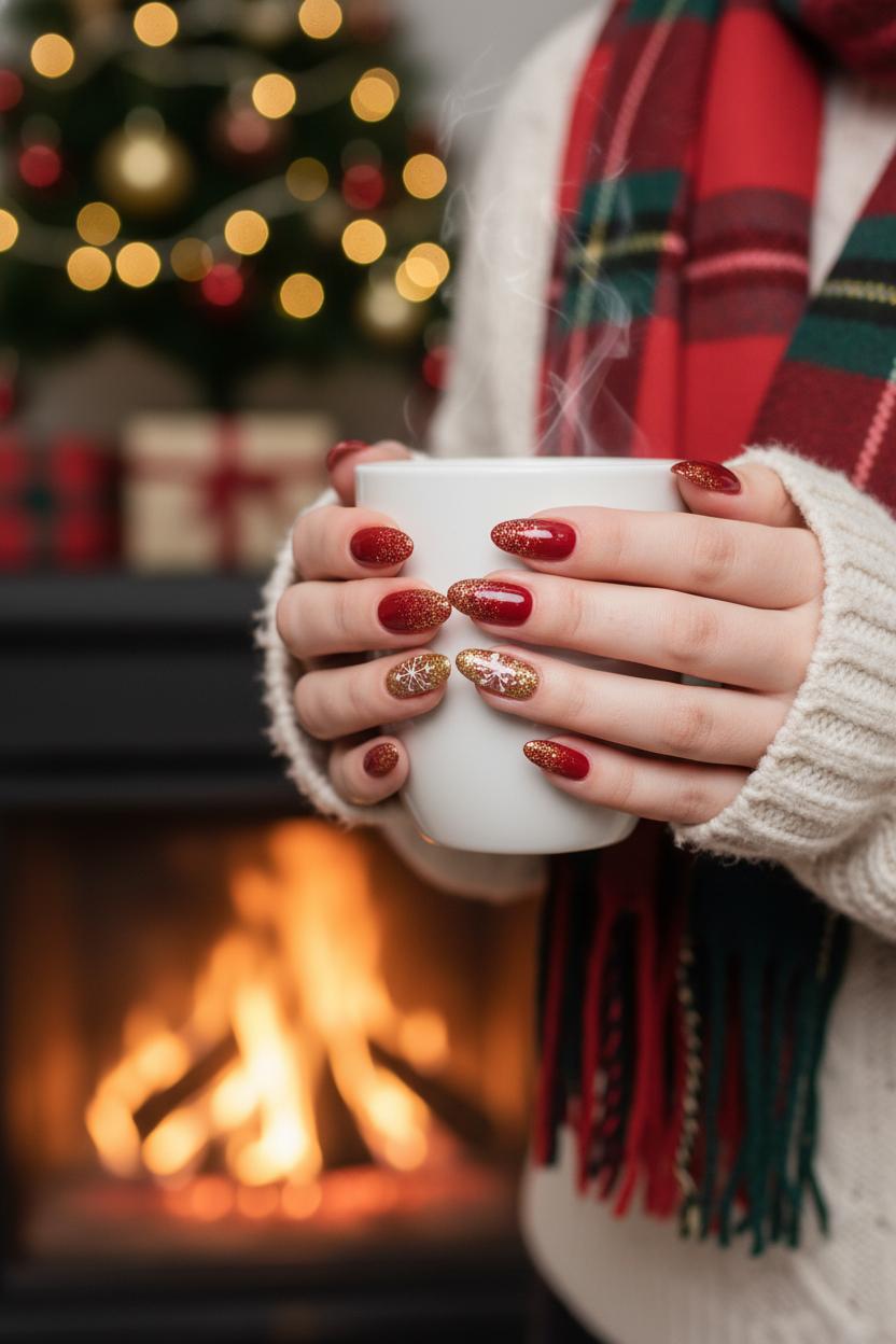 Imagine the glow of the fireplace dancing across your fingertips—that’s the magic of red glitter nails when the nights get frosty and the cocoa is steaming. For cozy christmas nails that still feel luxe, start with a rich base of red gel polish—think cranberry for classic cheer, or a deeper cherry for that velvet-ribbon vibe. Then add a sprinkling of gold nail glitter like tiny embers catching light. Micro-shimmer gives a soft twinkle, while chunky foil flecks add a fireplace crackle. I love a mix: a smooth red base, a hazy veil of ultra-fine sparkle, and a few scattered larger glints that look like holiday lights reflected in a window.
