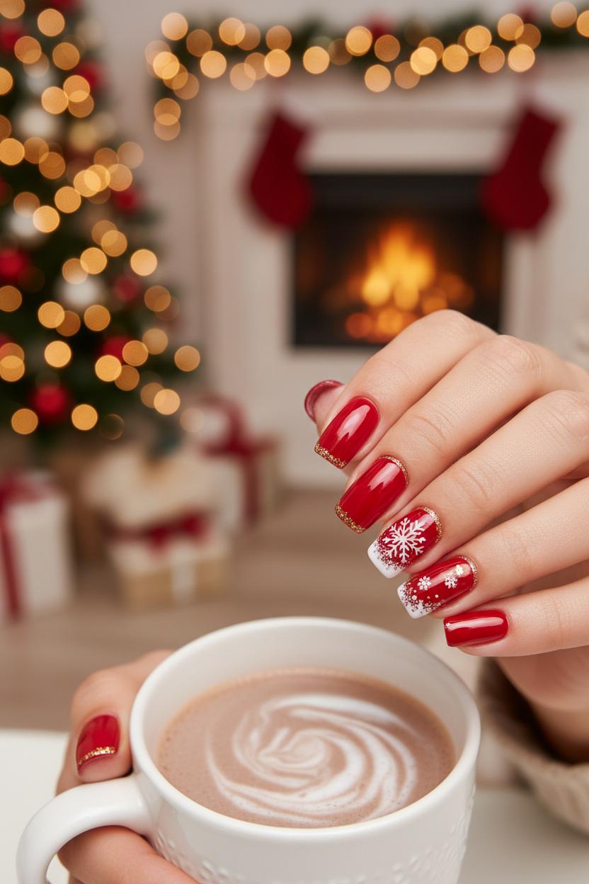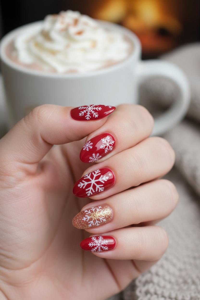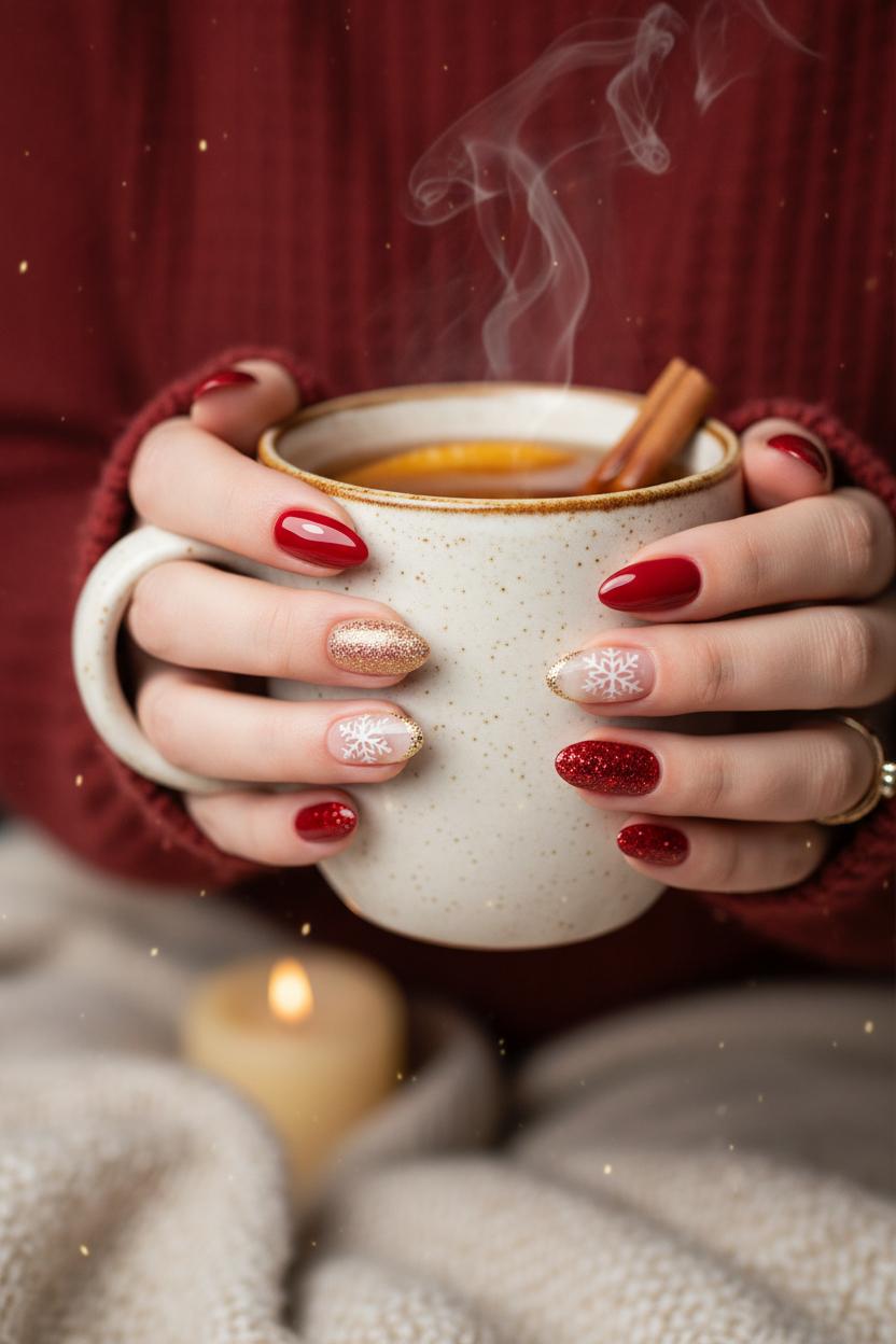 Think of this look as the nail equivalent of a knit blanket and a cinnamon candle: rich cherry reds, a whisper of gold, and tiny snowflakes catching the light. For christmas nails that feel instantly cozy, start with a creamy red gel polish as your base and weave in touches of gold nail glitter along the cuticle or as a soft gradient from the tip. If you love a little extra sparkle, red glitter nails turn every gesture into a mini holiday moment, especially when paired with a glossy top coat that looks like hard candy. The palette reads classic, but the finish is modern and wearable for any winter manicure, whether you’re wrapping gifts or clinking mugs at a fireside get-together.