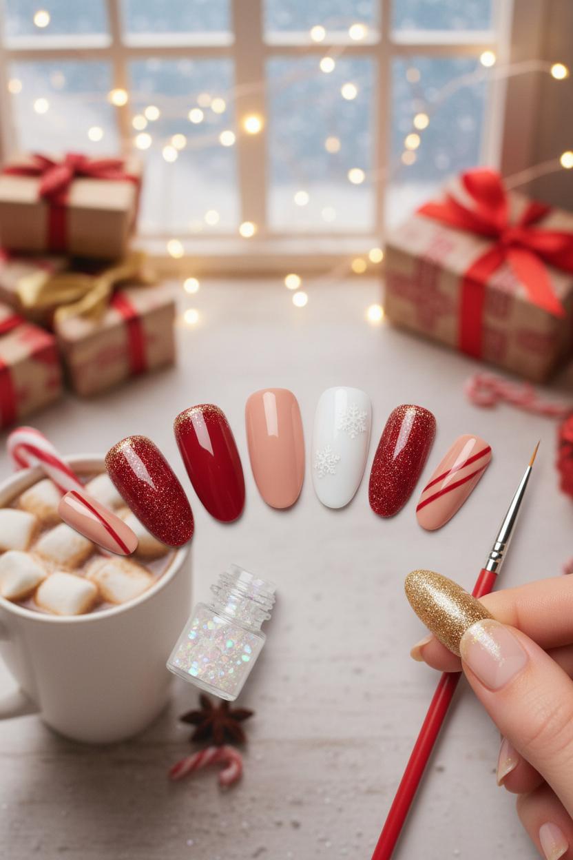 If you like to personalize, keep a tiny kit nearby: a bottle of red gel polish for a single candy-cane stripe, a nail art brush set for whisper-thin lines, and a vial of micro glitter for frosty French tips. Swap in a gold accent nail for a party, then trade it back to a cozy neutral for brunch—press-ons make quick changes painless and travel-friendly. However you tweak them, the vibe is all warm knits, ribbon-tied packages, and snow-dusted windows, with nails to match. Consider it your shortcut to polished holiday joy: fast, festive, and perfectly in tune with the season’s red, gold, and snowfall sparkle.