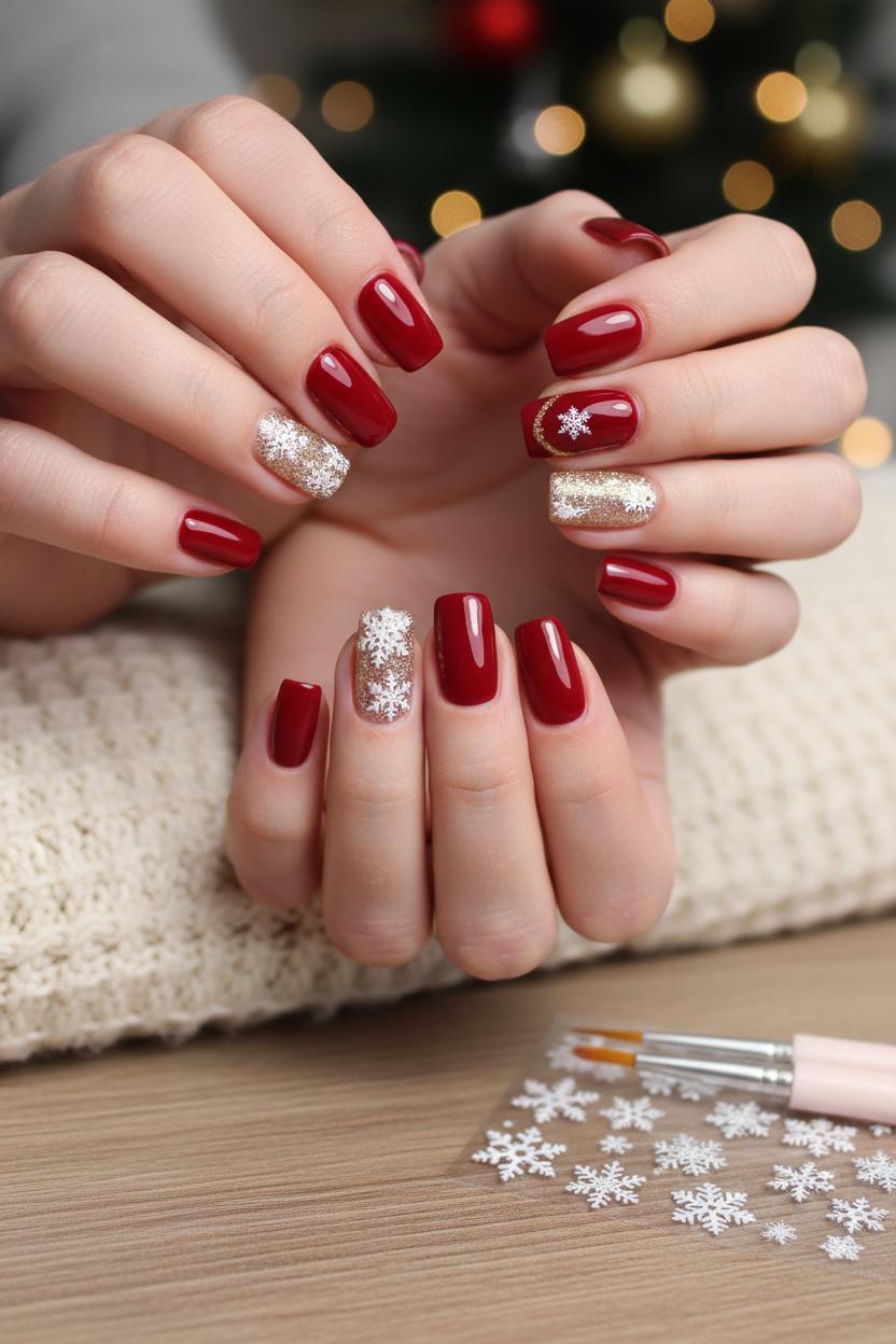 To take them from cute to “who did your nails?” level, layer simple accents that feel festive but effortless. A tiny sweep of gold nail glitter at the cuticle gives that cozy-luxe, candlelit gleam—especially dreamy over deep cranberry or classic red glitter nails. If you’re craving something snowy and sweet, place a couple of snowflake nail stickers on an accent nail and seal with clear top coat for crisp, no-stress snowflake nail art. Mix warm reds with soft nude or milky white press-ons for contrast, and suddenly your winter manicure looks thoughtfully styled, even if you assembled it in the time it takes a batch of cookies to cool.