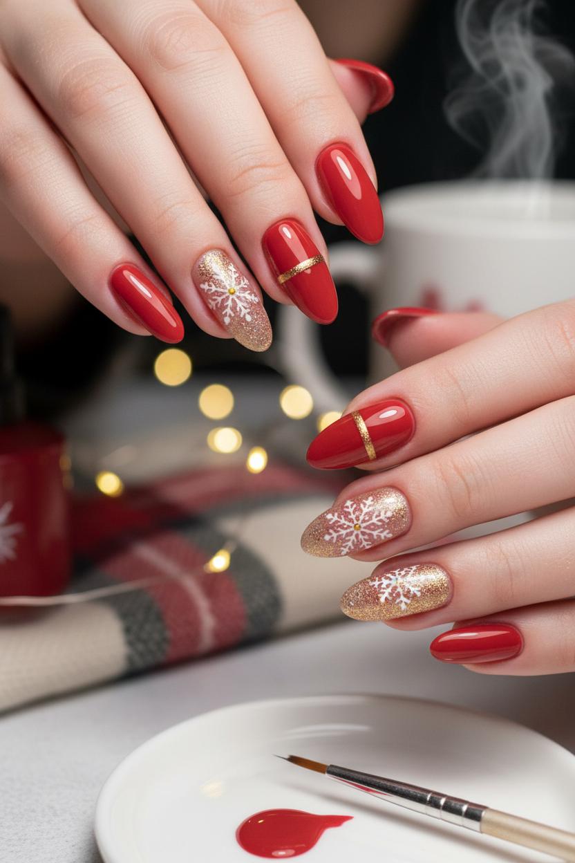 Snowflake details are where the magic happens. If you’re into intricate snowflake nail art, keep the red and gold simple and let one or two accent nails carry the motif. Hand-painting with a nail art brush set gives a delicate, lacy look, while snowflake nail stickers are a quick, crisp alternative that still photographs beautifully. Try a sheer milky base for your accent nail so the flakes float like fresh powder, then anchor the design with a thin gold line or micro glitter at the tip. Not into hand painting at all? Press on nails christmas sets now come with ready-made snowflake patterns and gilded touches, making them a fuss-free option for last-minute holiday nail ideas.