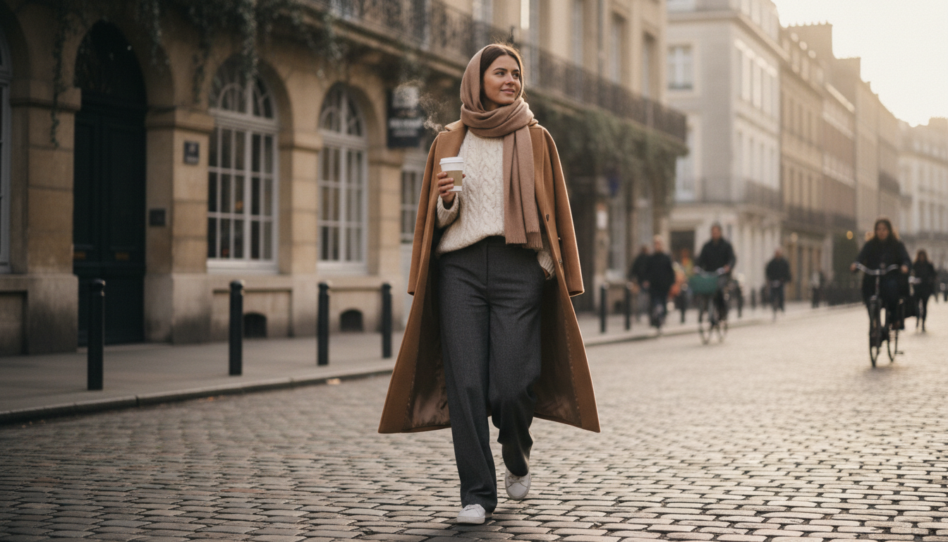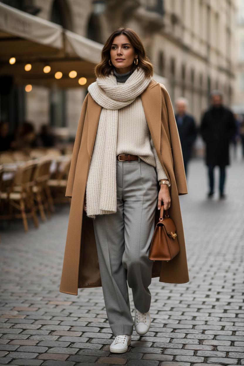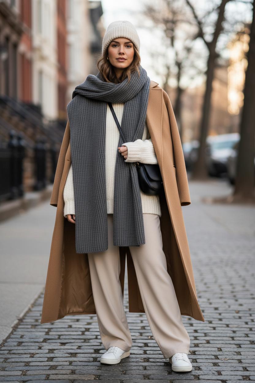 Build around the scarf like you would a great blazer. Start with foundations you can repeat all season: a chunky knit sweater women often search for (type “chunky knit sweater women” and you’ll see the idea), wide leg trousers in a soft drape, and those clean white leather sneakers to keep things light. Top with a camel wool coat for instant polish, then experiment with shape. Try the cozy loop (wrap once, tuck ends), the shoulder toss (one end cross-body, the other over the opposite shoulder), or the belt trick (drape straight and cinch both coat and scarf at the waist). Each technique shifts proportions and makes simple winter outfit ideas feel fresh. Keep your palette cohesive—creams, camels, charcoal—or let one saturated scarf be the statement among neutrals. Finish with minimal jewelry, a crossbody, and a confident stride. The oversized scarf doesn’t shout; it frames you, softening lines and anchoring your look in that lived-in, city-cool comfort we’re all chasing.