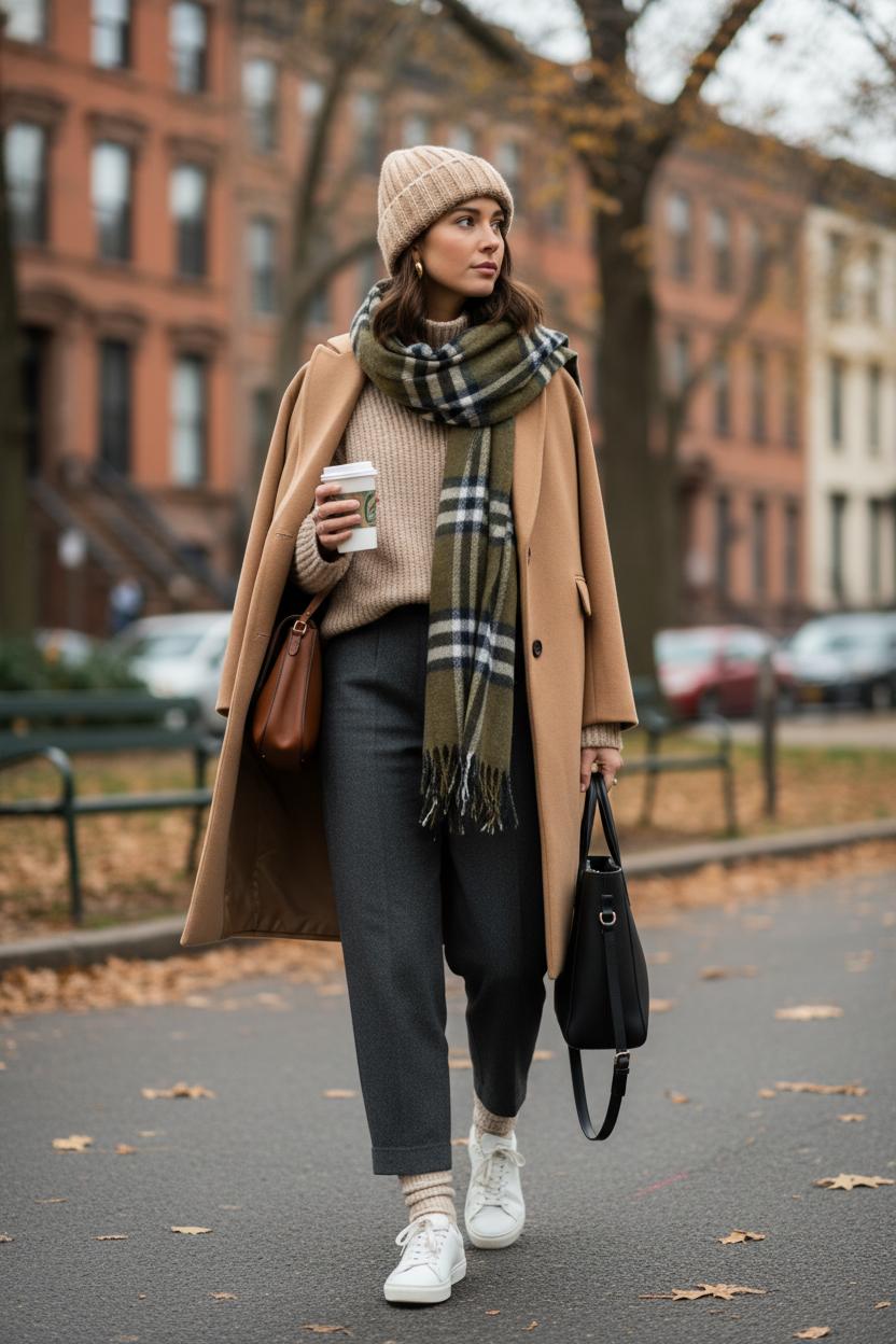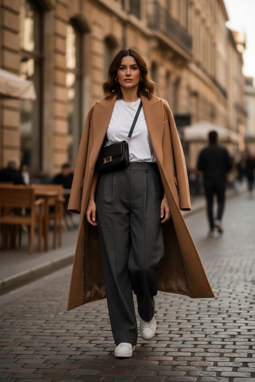 What makes this feel so wearable is the mix: a little streetwear casual, a little refined tailoring, and a whole lot of comfort. Neutrals anchor everything (camel, charcoal, cream, inky black), then you play with proportion—slouchy on top, structured on bottom, or vice versa. A silk tee under wool, a pop of stripe beneath a coat, a textured beanie that feels more accessory than afterthought. As temps dip, these same pieces evolve into winter outfit ideas with small tweaks: slip a thin puffer vest under that camel wool coat, swap a lighter scarf for an oversized scarf in plush knit, and trade cropped pants for full-length wide leg trousers that skim the shoe. The effect is modern and unfussy, like you just stepped out for fresh air and inspiration—because you did. This season, we’re building a closet of urban chic outfits that carry you from desk to dinner, weekend markets to late-night strolls, with layers that feel intentional and lived-in. Consider this your invitation to lean into texture, embrace volume, and let your essentials—chunky knit sweater women, white leather sneakers, and a wear-forever camel wool coat—do the quiet, stylish heavy lifting.