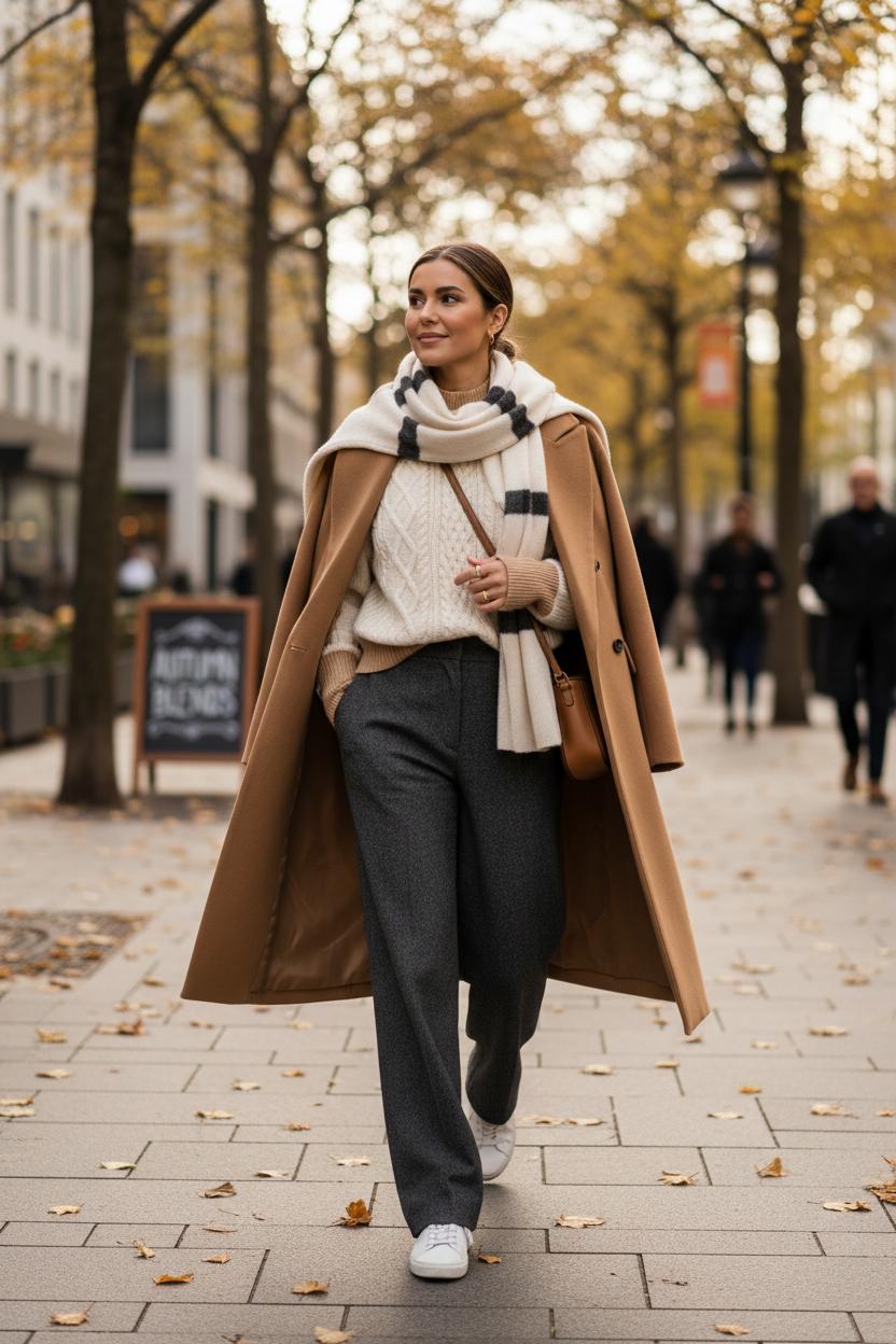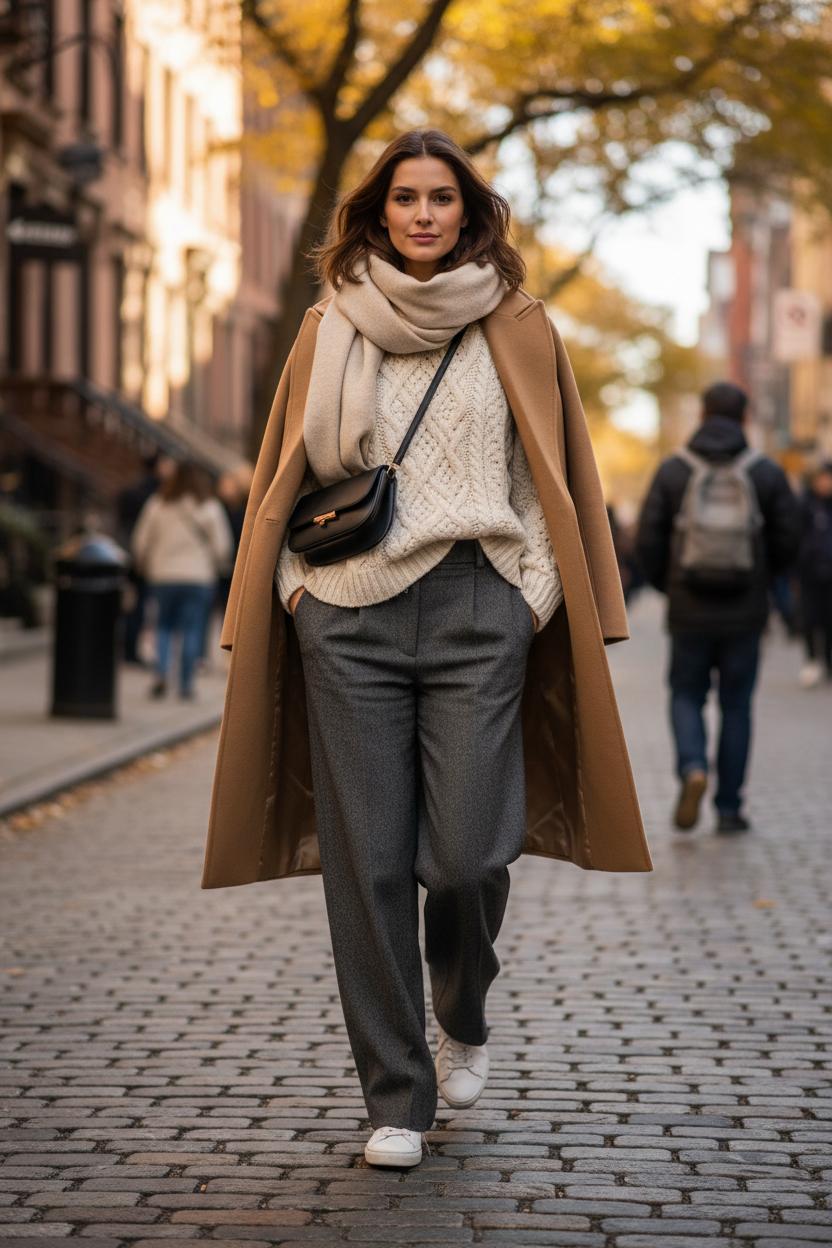 When the temps drop, I love leaning into layers that feel snuggly but still read sleek on the sidewalk—think cozy city style with a little edge. Start with a chunky knit sweater women love for its cloud-soft texture, then anchor it with drapey wide leg trousers that puddle just right over white leather sneakers. The contrast keeps it streetwear casual without trying too hard: relaxed, clean, and easy to move in. Wrap everything in a camel wool coat and let an oversized scarf spill over the lapels for that effortless, just-threw-it-on finish. It’s the kind of combo that works from coffee runs to gallery afternoons, and the proportions—boxy on top, fluid below—create the most flattering, elongating line. If you’re feeling playful, swap the sweater for a zip-up hoodie under the coat, or add a ribbed beanie and gloss-balm lip to bring the look together.