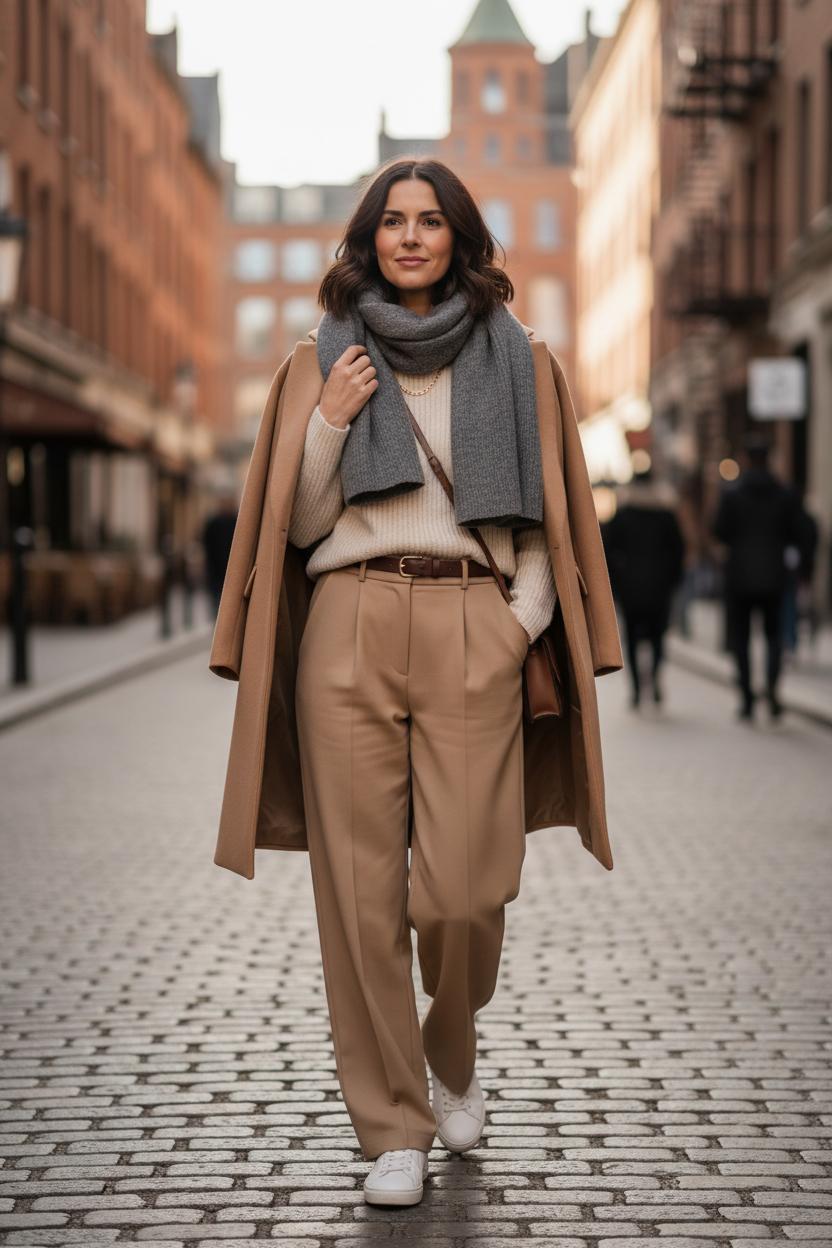Think of neutrals, camels, and creams as your city-friendly color toolkit—the tones that make every look feel elevated without trying too hard. Start with a latte-inspired base: creamy ecru, oatmeal, and soft stone layered together for that cozy city style we all crave when temperatures dip. A camel wool coat instantly warms up the palette and adds polish; let it drape over a chunky knit sweater women keep reaching for, then balance the softness with structured wide leg trousers in a cool taupe or greige. Keep textures tactile and touchable—ribbed knits, brushed wool, nubby bouclé—so your monochrome looks never feel flat. If you love a bit of contrast, add dove gray or inky charcoal in a slim turtleneck or belt, then pull it back to light and airy with white leather sneakers for a fresh, modern finish. The result is that effortless blend of urban chic outfits and streetwear casual: relaxed but refined, simple but styled.