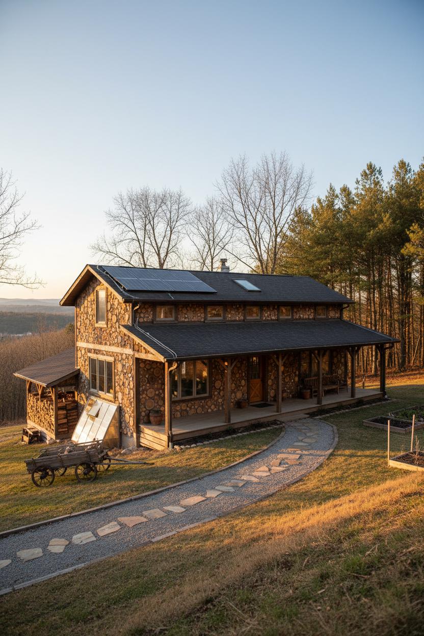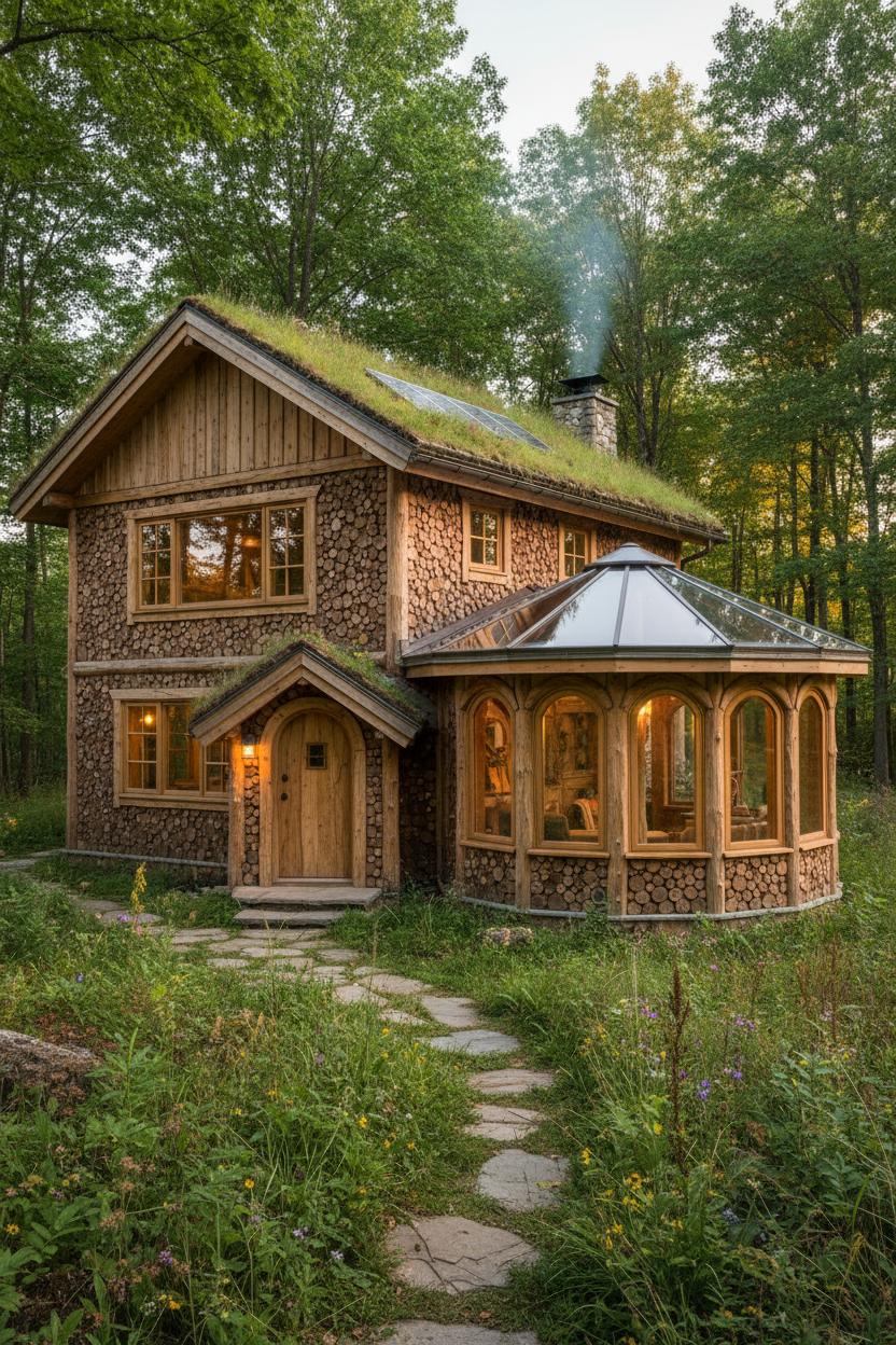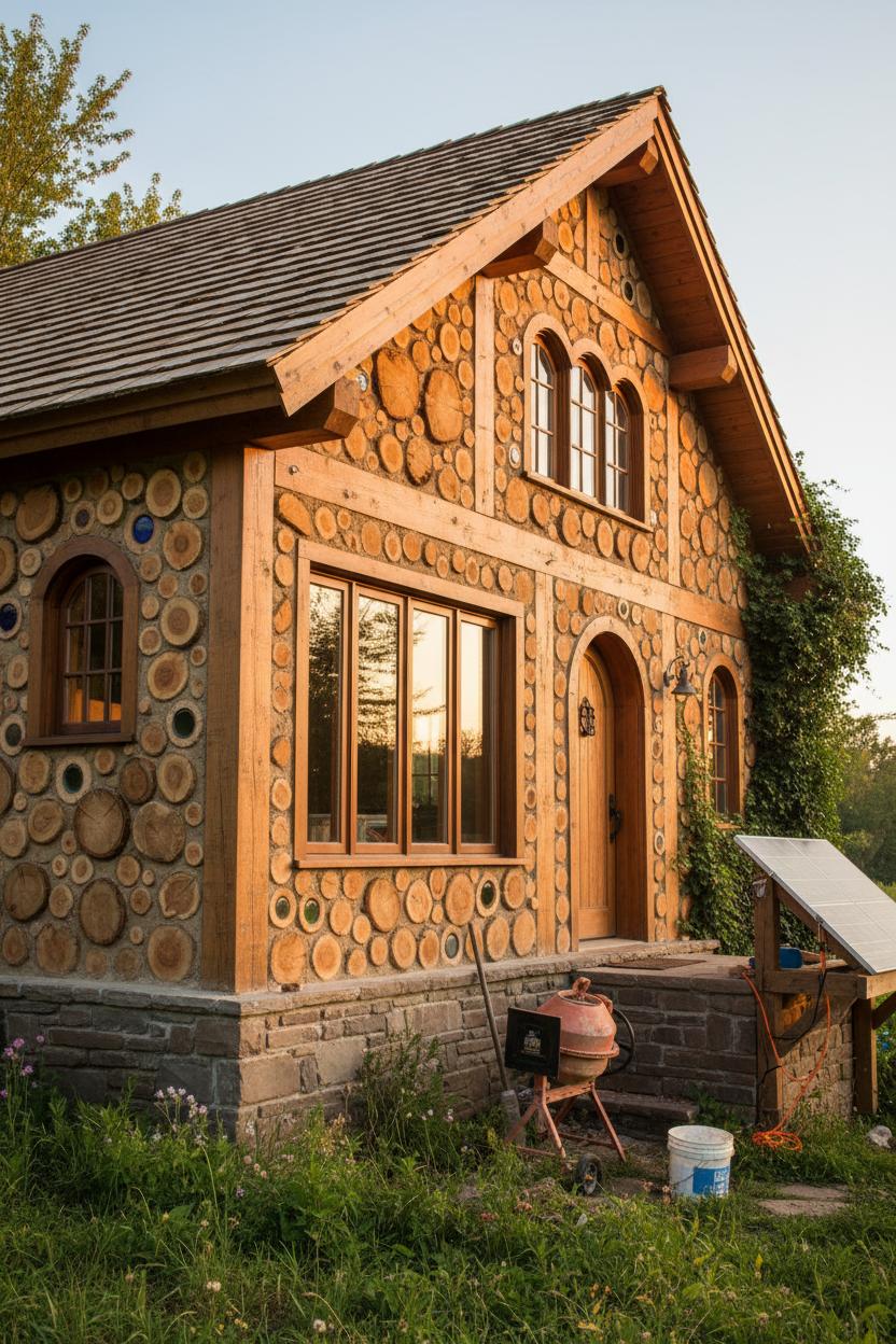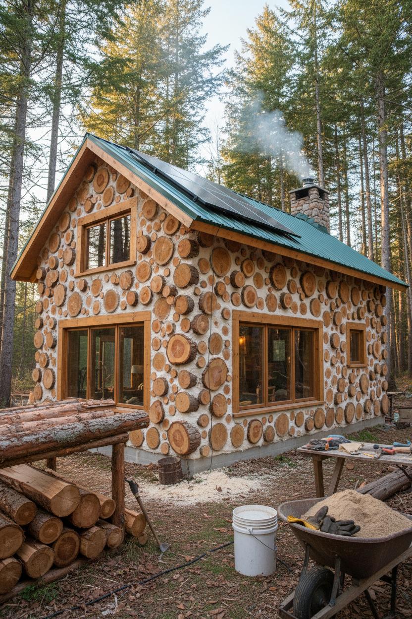 Imagine stacking round, honey-colored log ends like cookies in a thick quilt of mortar, and you’ve got the heart of a cordwood house. In cordwood building, short pieces of firewood (often 12–16 inches long) are set with their log faces exposed, while the spaces between are filled with an insulating mortar mix—traditionally sand, lime, a bit of cement, and organic insulation like sawdust or wood chips. The result is a textured wall that looks like a woodpile turned sculpture, with gorgeous patterns, occasional bottle-glass accents, and a cozy cabin feel that’s hard to resist. Most modern cordwood homes are built as infill within a simple post-and-beam frame, which carries the roof while the cordwood walls provide insulation and beauty. Design-wise, think practical romance: a raised foundation to keep moisture at bay, wide roof overhangs, breathable finishes, and smart passive-solar moves like generous south-facing windows and smaller openings on the north side. Whether you’re dreaming of a snug DIY cabin or a full-time natural home, the look is warm, handmade, and welcoming.