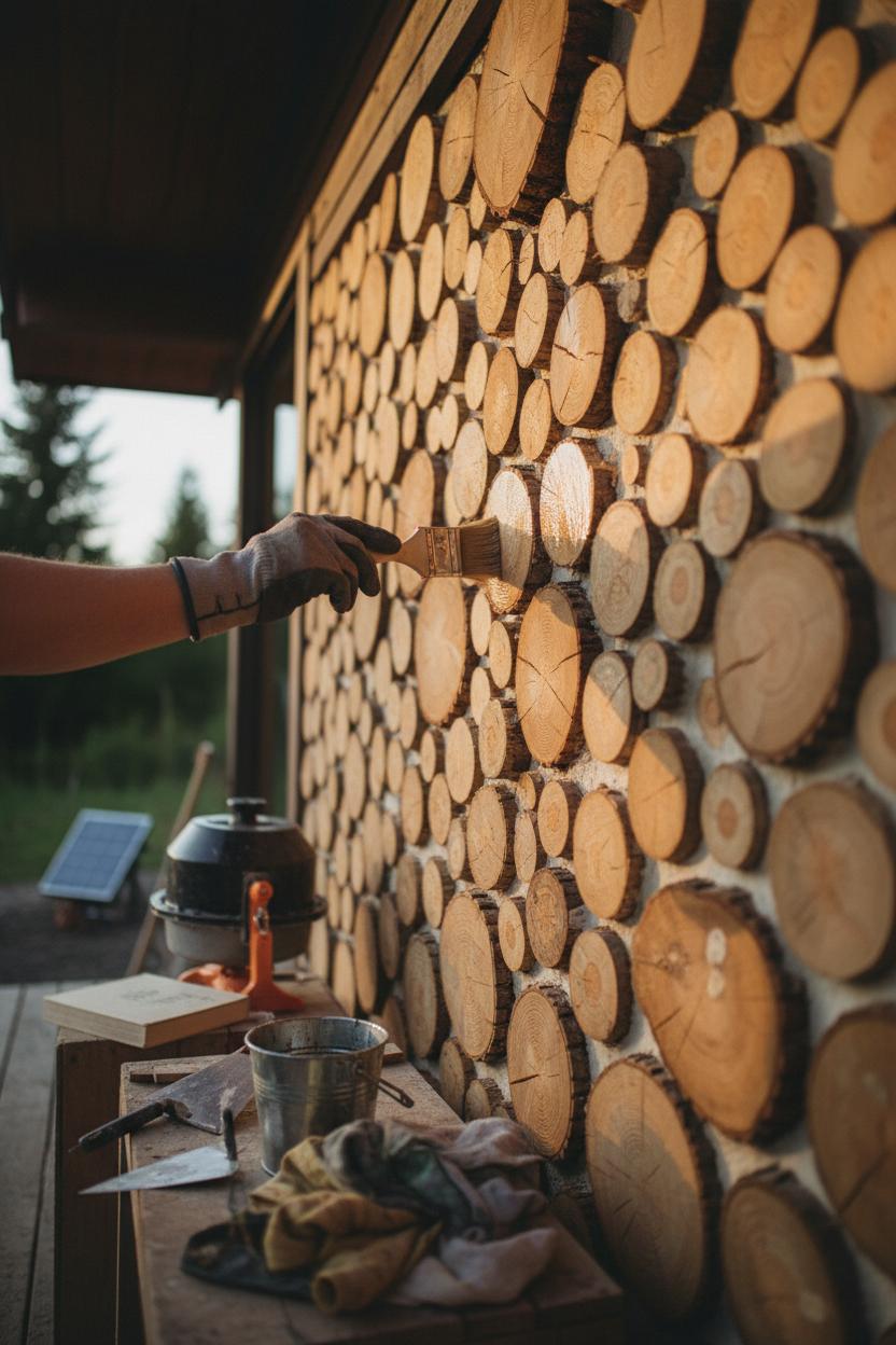 Look for a thick, purpose-made log end sealer—clear or softly amber, low-VOC, with UV resistance—so you protect the wood without plasticizing it or hiding the grain. The ideal time to apply is right after you cut your rounds (within hours if you can), and then again once the wall is stacked and cured so the exposed ends are fully dressed for the weather. Work on clean, dry wood in the shade; brush or roll a generous coat over the entire end grain, edge to bark, paying special attention to visible checks. Two light coats are better than one gloopy one. Wipe drips off the mortar while it’s fresh. Then make it a habit to inspect each spring and after the first hard freeze—south- and west-facing walls may want a refresh every couple of years. Skip this step, and freeze–thaw cycles can pump water into the wall, invite decay, and create insect highways. Do it right, and your sustainable home keeps its integrity and charm.