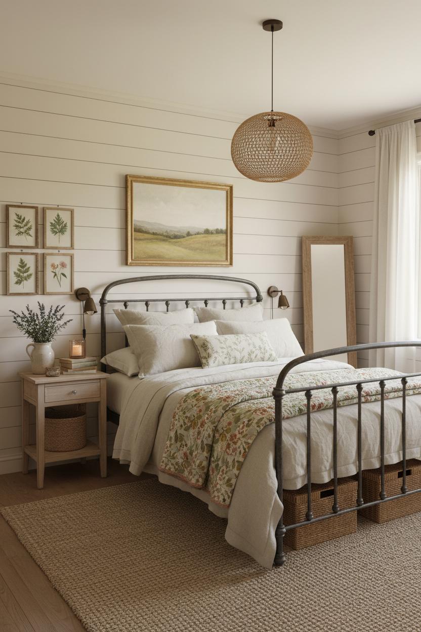 Start with the bones: crisp shiplap, a classic iron bed, and a palette of soft neutrals that makes everything feel instantly calmer. Whether you’re building a cozy cottage bedroom from scratch or tackling a small bedroom makeover, shiplap sets a charming backdrop that’s both rustic and refined. Paint it warm white or a creamy greige to bounce light and let your textures shine. An iron bed—matte black or weathered charcoal—adds that timeless farmhouse bedroom silhouette, grounding all the softness with a hint of sturdy, vintage character. From there, lean into layers: a lived-in linen duvet cover that puddles at the edges, a folded vintage quilt at the foot for pattern and nostalgia, and a couple of overstuffed pillows to make the whole scene irresistibly nap-worthy. Neutral doesn’t have to be boring; think oat, sand, and soft mushroom, with blush or sage peeking through in a throw or floral pillow for that whisper of cottagecore decor.