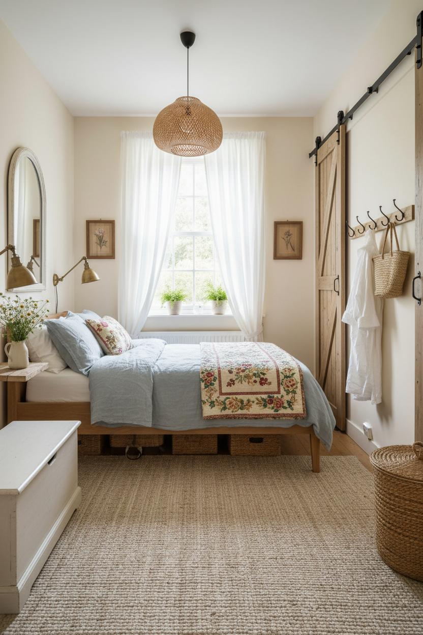 Then layer in cozy textures and gentle light. Drape the bed in a breathable linen duvet cover and fold a vintage quilt at the foot for pattern and story. Swap harsh overhead lighting for a rattan pendant light that casts a warm, dappled glow, and flank the bed with a farmhouse nightstand where a crock of wildflowers and a stack of paperbacks can live. Underfoot, a woven area rug softens wide-plank floors and quiets morning footsteps. Keep the palette earthy—cream, oatmeal, soft sage—so the wood is the star, and let woven baskets, stoneware, and framed botanical prints round out the scene. For a small bedroom makeover, think visually light: wall-mounted sconces instead of bulky lamps, low-profile bed frames, and floor-to-ceiling curtains that make ceilings feel taller. Whether your style leans more farmhouse bedroom or a softer, storybook cottage, the magic is in the patina, the nubby textiles, and the way every surface invites you to exhale and settle in.