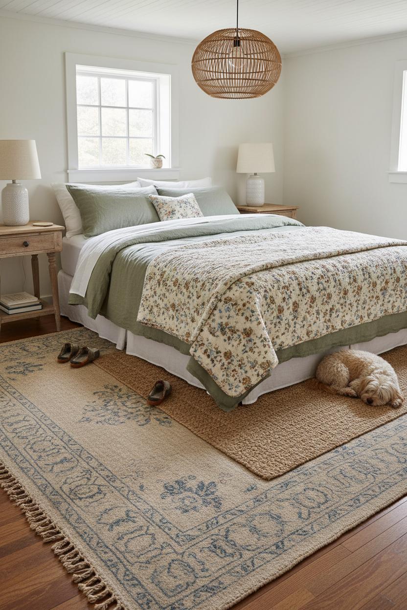Sizing is everything in a farmhouse bedroom. Under a queen bed, an 8-by-10 woven area rug usually frames the scene so both sides and the end get that cozy landing; in tighter footprints, a 6-by-9 can still work, or try two slim runners on either side for a smart small bedroom makeover. For color, think heathered oatmeal, faded indigo, or soft sage to tie in a linen duvet cover and vintage quilt without competing with their pattern. Subtle stripes, petite florals, or a worn, Persian-inspired print add a collected feel that suits rustic bedroom ideas, while braided edges and fringe bring a hint of handmade charm. If your space leans busy with beadboard and a rattan pendant light, choose a calmer rug; if you’re keeping the bedding simple, let the rug carry the story.