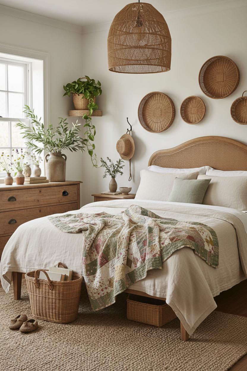 Baskets add instant warmth and texture, and they’re wonderfully practical. Slip a low lidded basket under the bed for extra linens, pile woven totes by the door for books and slippers, or create a mini gallery wall with shallow rattan trays to echo the curves of your headboard. A rattan pendant light brings a soft, dappled glow that feels like late-afternoon sun through trees, while a woven area rug underfoot layers in that nubby, natural feel that every farmhouse bedroom craves. For easy styling, pair a sturdy market basket with a stoneware vase and a stack of favorite reads—humble, useful, beautiful.