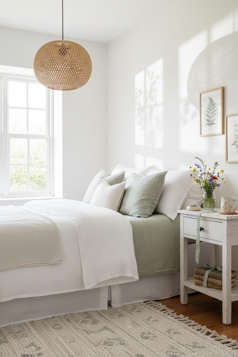 When the seasons shift, your cozy cottage bedroom can too—without a full redesign. In spring, trade weighty textiles for breathable layers and let the space exhale: a fresh linen duvet cover, crisp cotton pillowcases, and a breezy palette of chalky whites, buttercream, and soft sage instantly brighten the room. A rattan pendant light casts gentle, dappled shadows that feel like sunlight through leaves, and a woven area rug underfoot softens the transition from chilly mornings to warmer days. Style your farmhouse nightstand with a bud vase of wildflowers, a stack of well-loved paperbacks, and a ceramic dish for rings, and weave in cottagecore decor with subtle florals, gingham ribbons, and a hand-thrown mug for tea. Even in a small bedroom makeover, swapping art prints for botanical sketches and rotating in glass lamps or clear accents keeps things airy without sacrificing charm.