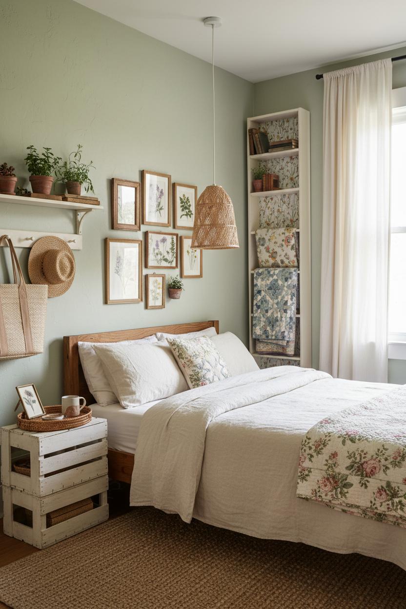 Light is the secret sauce of every cozy cottage bedroom, especially in a small room. Think pale walls—warm whites, buttercream, or soft sage—paired with breezy curtains that filter daylight. A rattan pendant light casts a gentle, dappled glow that feels like sunshine through a basket, while a couple of low-watt bedside lamps layer in warmth after dark. Mirror the light by placing a mirror opposite the window and choosing lighter finishes for key pieces. On the bed, a linen duvet cover brings airy texture that breathes beautifully, and a vintage quilt folded at the foot adds color, story, and that treasured-handmade vibe. Sprinkle in cottagecore decor with botanical artwork, wicker baskets, and a little pitcher of wildflowers to keep things sweet and unfussy.