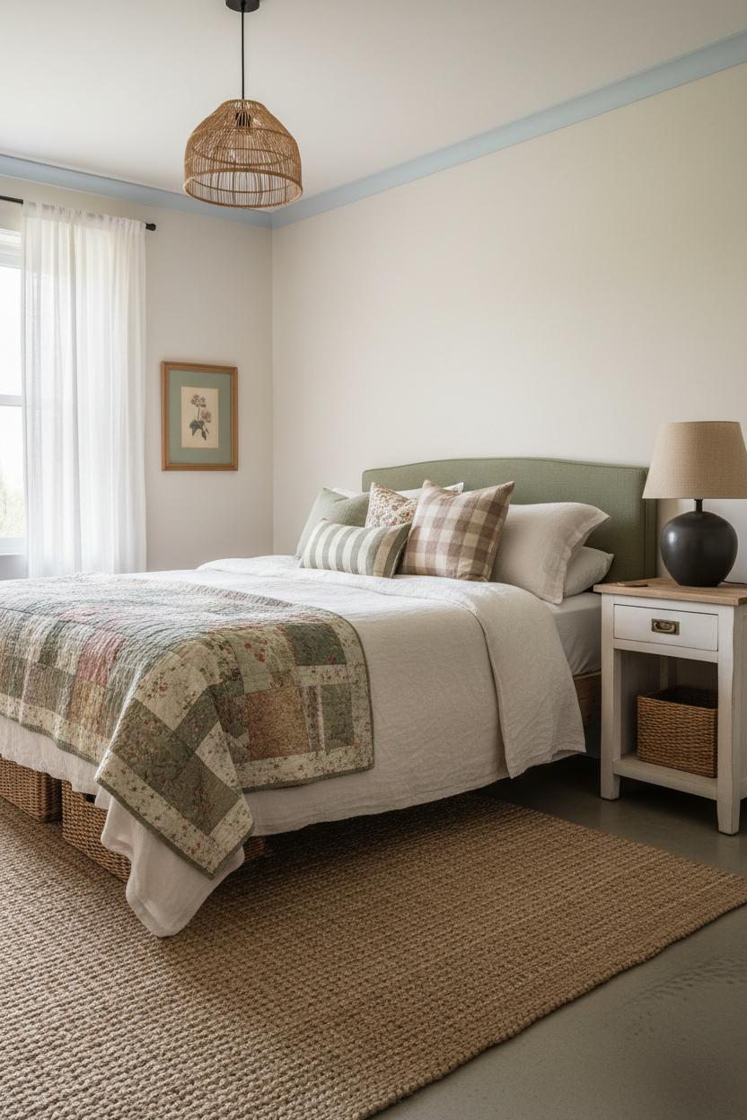 If you’re working on a small bedroom makeover, layering is your best friend, but keep it airy. Stick to breathable materials and edit the number of pillows so it feels abundant, not crowded. Lighting matters here too: a rattan pendant light frees up surface space while casting a warm, dappled glow that flatters every texture on the bed. Keep a simple farmhouse nightstand within reach for a book and a candle, and ground the whole nook with a woven area rug that adds warmth without visual heaviness. For seasonal shifts, let the vintage quilt take center stage in spring and summer, then tuck a down insert inside the linen duvet cover and add a faux-fur or mohair throw for winter. Embrace a little imperfection—linen looks loveliest with a natural crinkle—and keep the palette cohesive so your layers feel collected, not cluttered. These easy, tactile choices are the secret to rustic bedroom ideas that still feel refined and livable, the kind of farmhouse bedroom that makes you exhale the second you walk in. Add a sprig of lavender on the pillow, crack the window for a hint of fresh air, and your layered bed becomes the coziest retreat in the house.