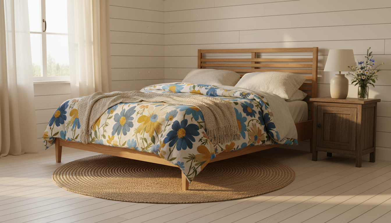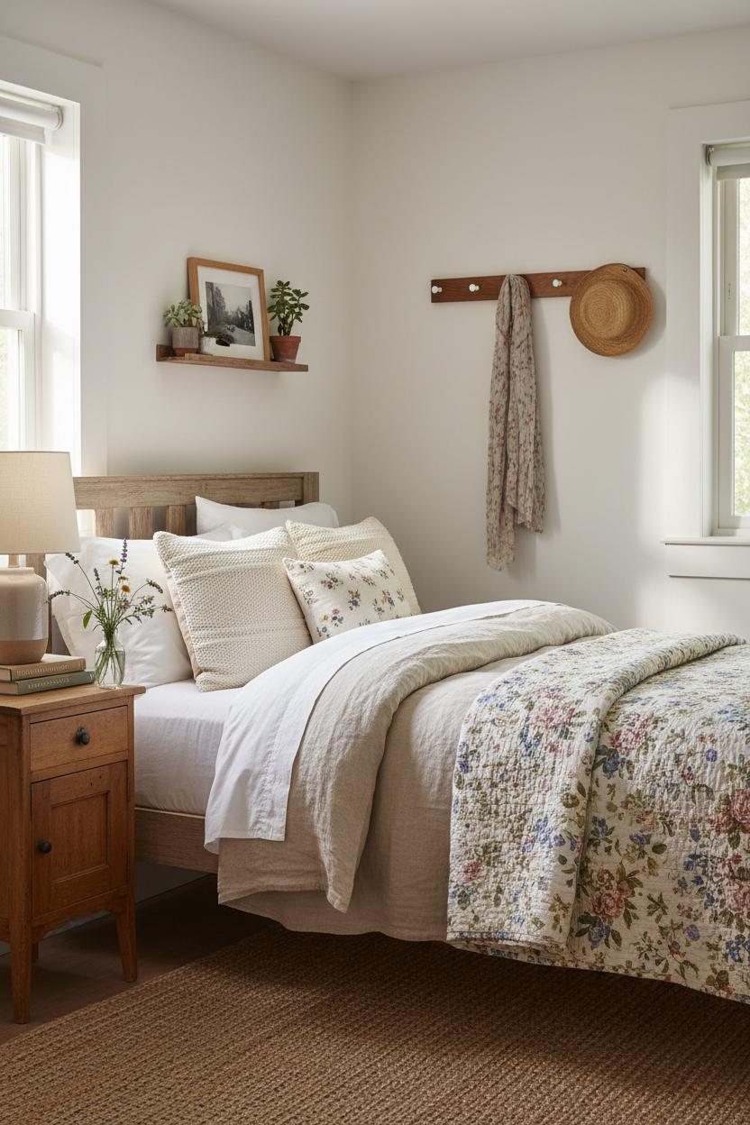 If you’re planning a small bedroom makeover, these elements still apply—just think slimmer silhouettes and light-reflecting tones. Choose a narrow nightstand with drawers for hidden storage, keep your palette sun-kissed and neutral, and let a linen duvet cover in oatmeal or soft white bounce the light around. A petite ceramic bedside lamp and a modest woven jute rug define zones without crowding the floor, while a floral quilt set folded at the end of the bed adds personality without visual bulk. In the end, the harmony of warm woods and soft linens is the secret sauce of cottage bedroom decor—inviting, unfussy, and endlessly layerable, no matter the room size.