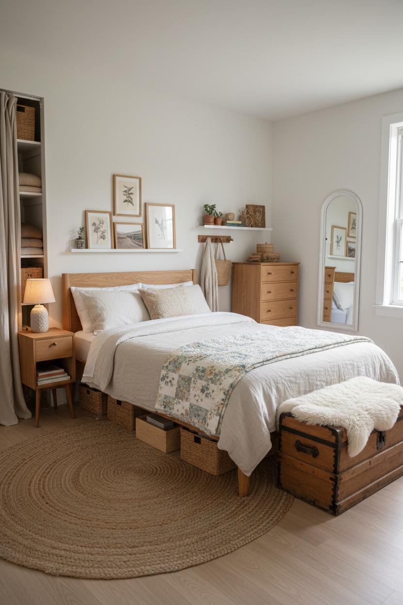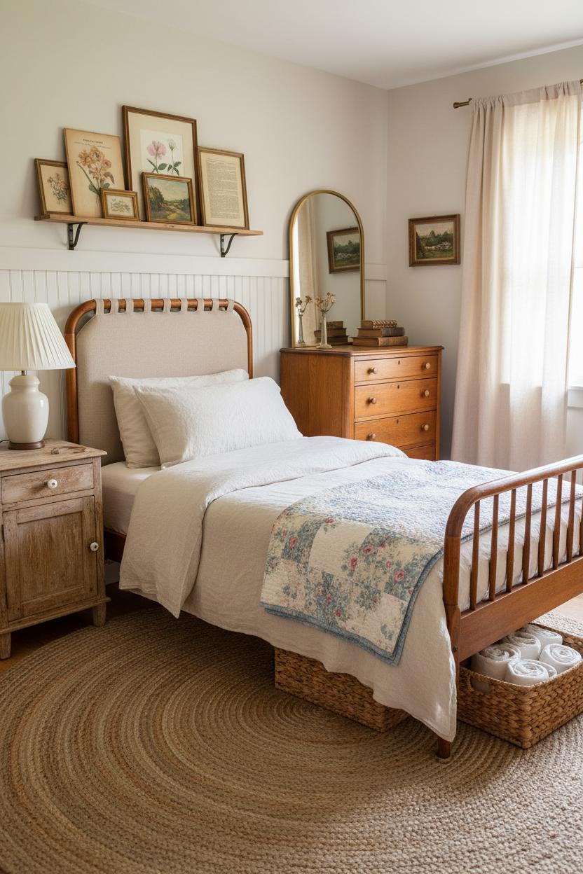 When space is tight, think of your bed as the anchor and build smart storage around it. In a small bedroom makeover, try centering the bed on the longest wall to create breathing room, then substitute bulky side tables with a slim vintage wood nightstand on one side and a shallow wall shelf on the other. A petite ceramic bedside lamp keeps things cozy without crowding, while wall-mounted hooks or a peg rail stand in for extra drawers. Under the frame, slide woven baskets or rolling boxes for off-season linens and books; top the mattress with an airy linen duvet cover and layer a floral quilt set at the foot for that layered, storybook look. A woven jute rug underfoot adds texture, frames the furniture, and visually expands the floor, especially when it runs slightly wider than the bed. These are the kinds of cozy bedroom ideas that feel intentional instead of improvised—lightweight, warm, and quietly functional.