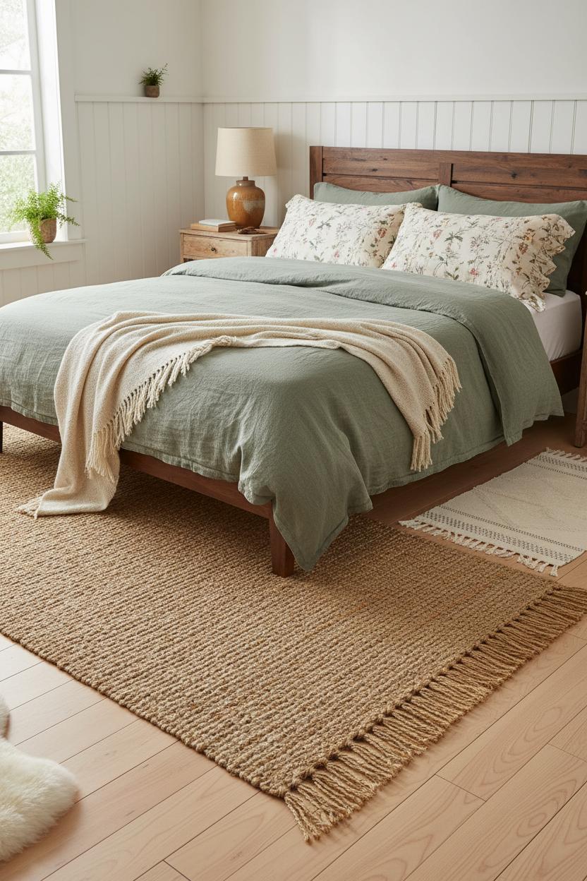 A woven jute rug is the quiet hero of cottage bedroom decor, the piece that instantly grounds all those warm woods and soft linens and makes the space feel finished. Its sandy, handwoven texture adds that earthy layer every cozy bedroom ideas board craves—think golden straw underfoot, soft edges, and a natural weave that plays beautifully with a linen duvet cover or a fluttery floral quilt set. In a farmhouse bedroom, the rustic fiber keeps everything humble and relaxed; in a cottagecore room, the organic texture is the perfect foil for ruffled shams and botanical prints. Slide a generous jute rug beneath the bed so it peeks out on all sides, letting toes meet a gentle, springy surface each morning. If the room is petite, consider a larger size than you think—a small bedroom makeover trick that makes the footprint read wider while dampening sound and visually unifying the bed, a vintage wood nightstand, and a ceramic bedside lamp into one cozy vignette.