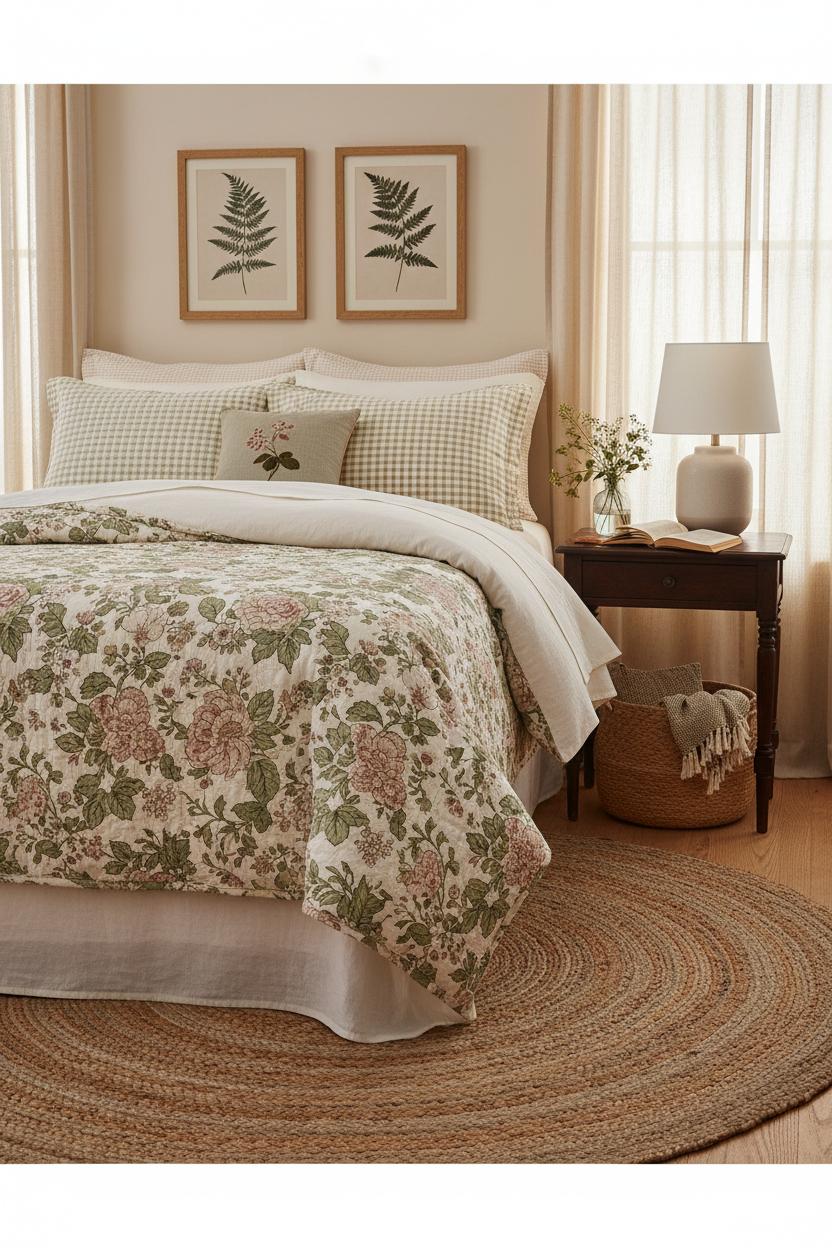When you want your bed to be the charming focal point without shouting for attention, start with a floral quilt set that feels like it was plucked from a garden sketchbook. Think soft moss, faded rose, and buttery cream dancing across breathable cotton—patterns that pop but still play nicely with warm woods and soft linens. I love to layer a quilt over a crisp linen duvet cover so the flowers take center stage while the duvet adds that cloudlike loft underneath. It’s the sweet spot between heirloom and everyday, the look that makes cottage bedroom decor feel collected over time. If your style drifts toward a farmhouse bedroom vibe, choose blooms that look slightly timeworn, and mix in petite gingham or subtle ticking stripes on shams for that “found at the flea market” energy. The bed becomes a seasonless canvas: pull out the rosy tones in spring, lean into the mossy greens when the air gets cool.
