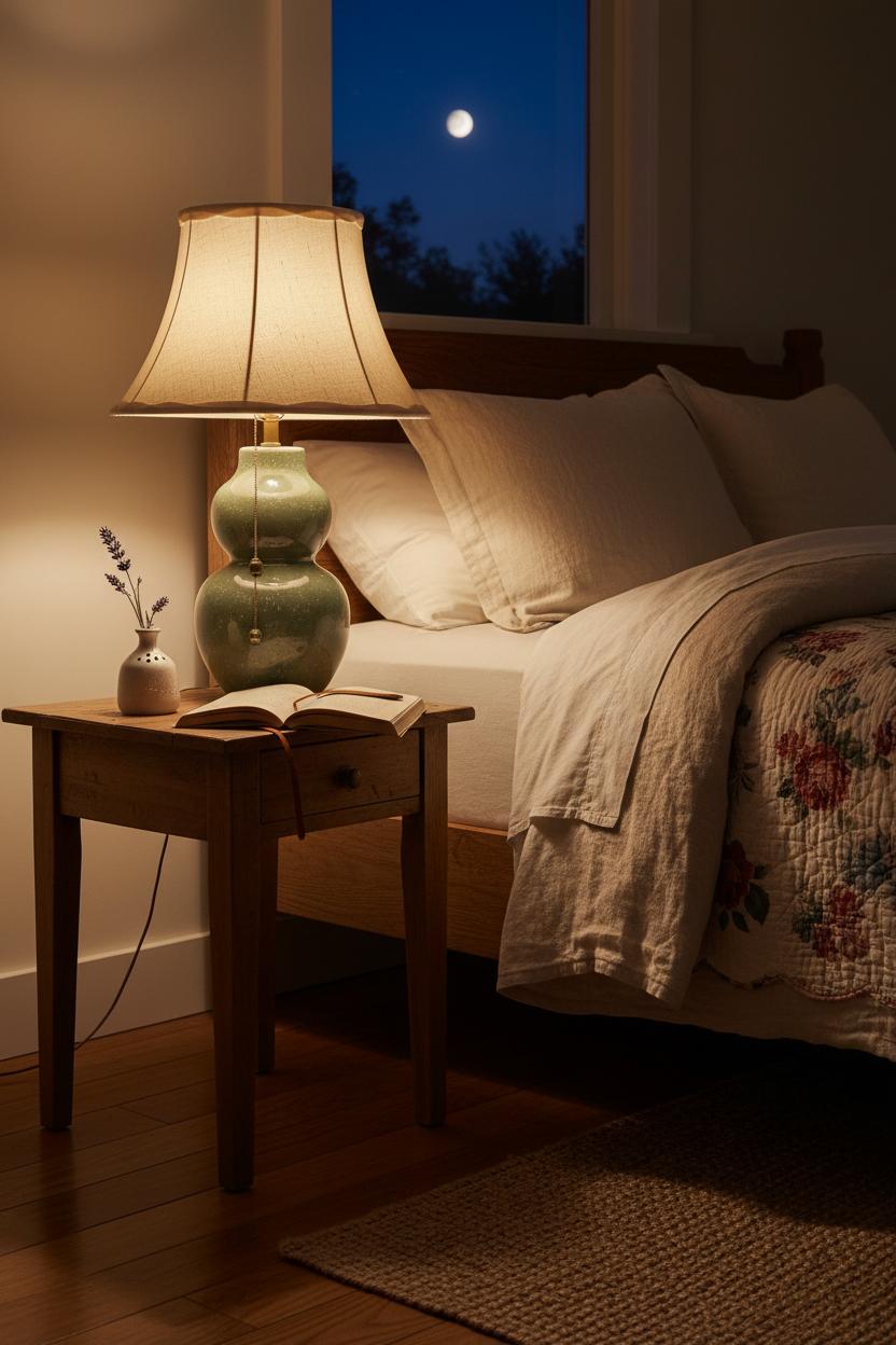 Color and texture do the heavy lifting at night, so let your ceramic bedside lamp whisper, not shout. Layer it beside a linen duvet cover in oatmeal or ivory and a floral quilt set at the foot of the bed for that collected, storybook look. On the floor, a woven jute rug softens footfalls and echoes the lamp’s earthy, tactile finish. Bulb choice is everything: go for a warm, frosted LED in the 2700K range and keep it around 40–60W equivalent so your pages glow without glare. A pull chain or turn knob feels charmingly old-school and ties in with other cozy bedroom ideas, but a discreet inline dimmer is a game-changer for late-night reading. And don’t forget the little details—hide the cord with a clip along the back of the nightstand, let a tiny match striker or a bud vase flank the base, and you’ve created a gentle vignette that glows as beautifully at 10 p.m. as it does in the first light of morning.
