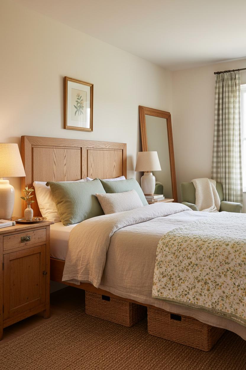 Working with a snug space? This palette is perfect for a small bedroom makeover because it bounces light around and keeps things serene. Choose off-white paint with warm undertones so honeyed oak accents don’t read orange, then repeat sage in small doses—curtains, a stripe, or a gingham—to keep the eye moving. Keep surfaces simple: a narrow nightstand, a petite lamp, a small tray for nightly essentials. Hide clutter in lidded baskets under the bed, and swap shiny hardware for aged brass to deepen the old-world mood. If you love pattern, layer it carefully: tiny florals on the quilt, a subtle stripe on the sheets, solids elsewhere. For cozy bedroom ideas that feel elevated, hang curtains high, lean a wood-framed mirror to reflect that creamy glow, and consider a single piece of art with soft greens to tie it together. The result is grounded and graceful—classic farmhouse bedroom comfort, softened with cottage charm and built for everyday living.