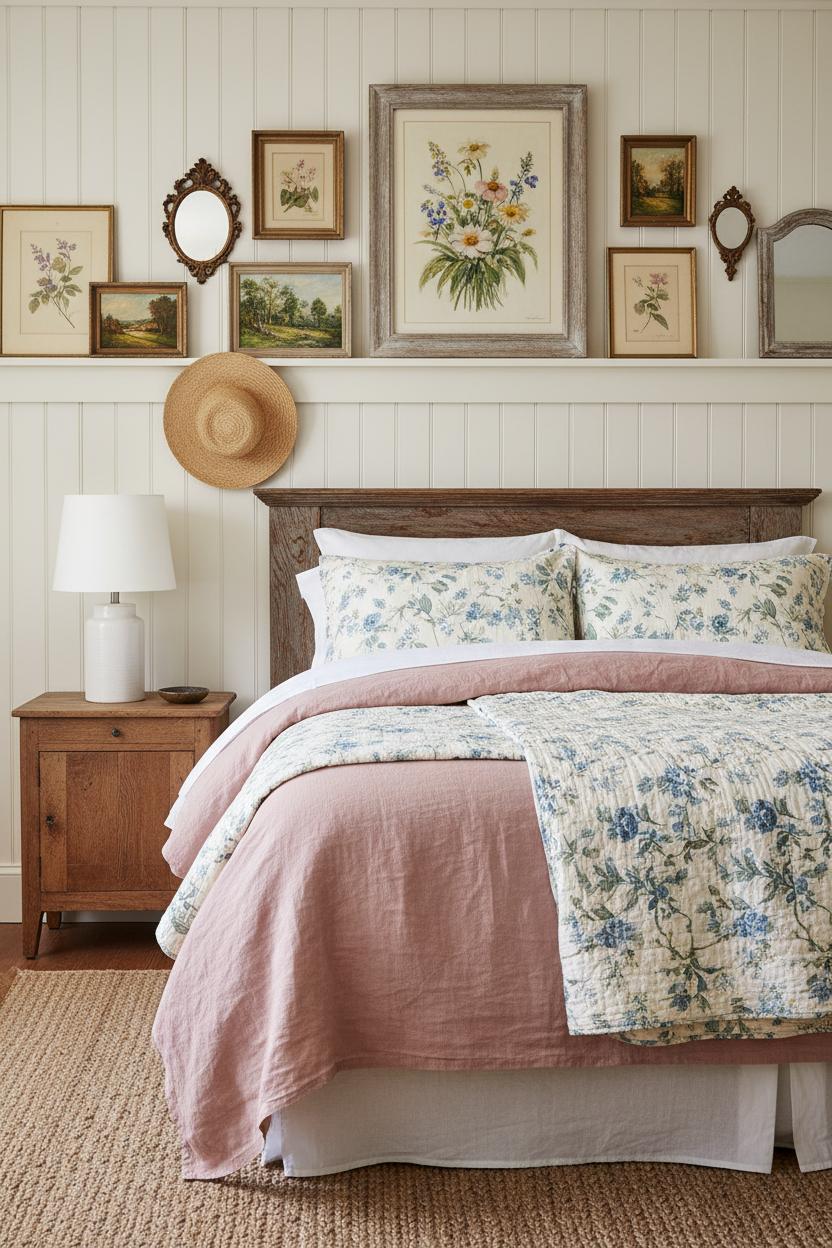 When you’re dreaming up the coziest backdrop for your bed, think in layers: a charming headboard shape, a textural wall, and art that feels gathered over time. Beadboard instantly says cottage bedroom decor, especially when it runs just high enough to cradle the headboard and create a gentle frame. Paint it a creamy white or a soft misty blue, and suddenly your linens look airier, your wood tones warmer, and the whole room feels hushed and restful. Shiplap has that crisp, farmhouse bedroom character—horizontal boards visually widen a narrow space, a great trick for a small bedroom makeover. Keep the boards matte and chalky, then let a linen duvet cover and a floral quilt set bring in the softness. If you’re working with a simple metal or slipcovered headboard, consider adding a shallow plate rail or ledge on the beadboard to perch tiny landscapes, pressed botanicals, or a sprinkling of vintage mirrors. The contrast of tidy millwork with collected treasures gives you that curated-yet-lived-in vibe that a cottagecore room is all about.