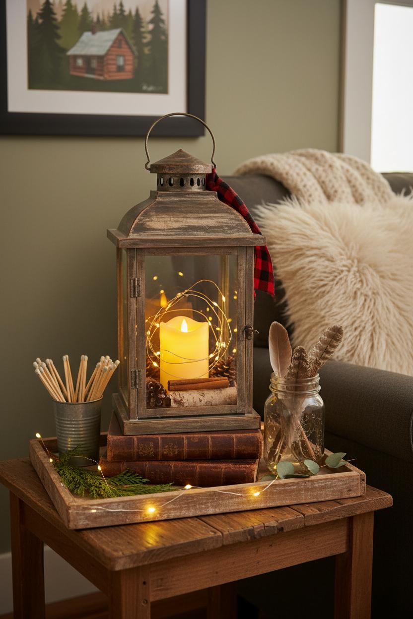 To complete the look, style your lantern on a reclaimed wood side table with a stack of well-loved paperbacks, a stoneware mug, and a few foraged finds—pinecones, a sprig of cedar, or dried grasses—to echo a woodland home style. Tuck a pillar candle inside the rustic lantern for a soft, flickering burn in the cold months, then swap to LED fairy lights when the days get longer, so the sparkle feels like captured fireflies. Rotate small accents to keep the mood evolving: switch out cabin wall art from vintage ski scenes to botanical fern prints, trade heavy wool throws for airy cotton, and refresh pillow covers to match your palette. These subtle shifts are the heart of smart rustic cabin ideas—little edits that transform the scene without clutter. Keep a neutral base, lean into tactile layers, and let nature lead your color story; with a couple of thoughtful seasonal switch-ups, your nook stays timeless, curated, and irresistibly snug all year round.