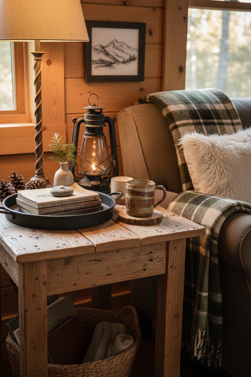 For styling, layer textures the way the forest layers moss and bark. Ground the top with a petite tray—matte iron for a hint of farmhouse rustic or creamy enamel for contrast—to corral the everyday pretties. Stack two or three trail guides or vintage novels, then top with a smooth river stone or a tiny bud vase holding a sprig of cedar. A rustic lantern adds an amber glow when the sun dips, and a hand-thrown mug feels right at home beside it. Play with height: a low candle, mid-height vase, and taller lantern keep the eye moving. If your nook backs a wall, lean a small piece of cabin wall art or a charcoal sketch for an effortless, collected look. Nearby, a chair draped with a plaid throw blanket and paired with a plush faux fur pillow pulls the palette together—bark browns, moss greens, creamy oatmeal—turning simple rustic cabin ideas into a scene you’ll want to curl up in for hours.