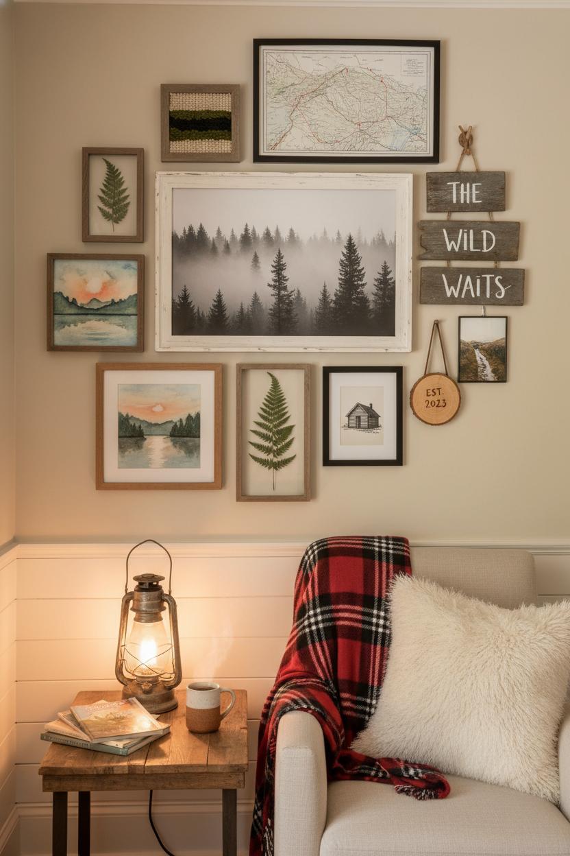 When the walls start telling your story, the whole nook comes alive. Think of each piece of cabin wall art as a postcard from your favorite trail: black-and-white pines that feel misty and quiet, a watercolor lake that shimmers at sunrise, a vintage topographic map that hints at hidden overlooks. Mix mediums for that layered woodland home style—pressed fern fronds in slim glass frames next to a hand-lettered quote on weathered boards, a small woven textile for warmth, and maybe a sketched cabin silhouette in a simple matte frame. If you love farmhouse rustic, whitewashed or chippy frames soften the look, while raw wood and iron keep it grounded. Go for one generous statement piece to anchor the wall, then let smaller accents orbit around it like campfire sparks, creating a collected, not curated, feel that suits true country cabin decor.