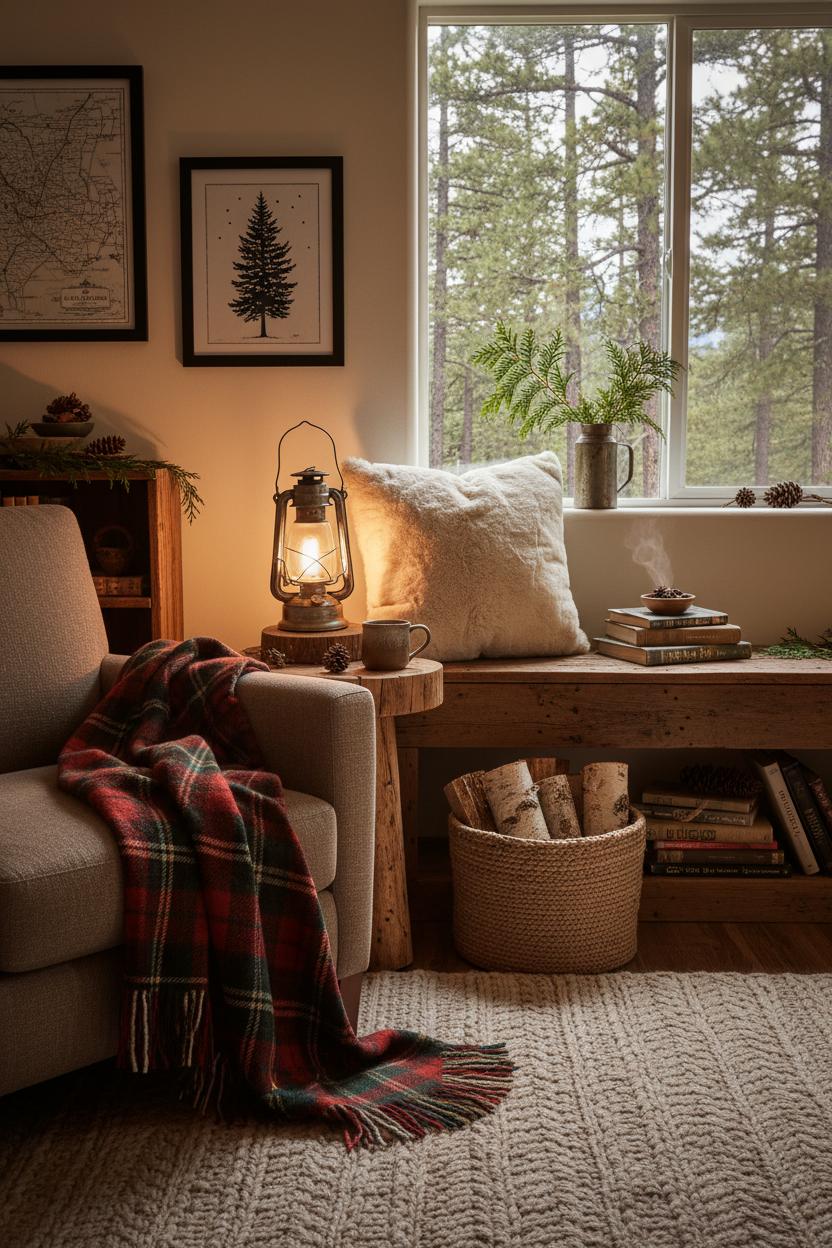 Nothing cozies up a nook faster than the hush of lantern light at dusk, and a rustic lantern is the little secret that makes the whole corner whisper “stay awhile.” Start by giving your lantern a home on a reclaimed wood side table so its glow feels grounded and natural, like it’s been part of your country cabin decor forever. Tuck a flameless pillar candle inside (choose a warm 2200–2700K tone) and layer in a few amber fairy lights for that dancing ember effect. Nestle bits of birch bark, cinnamon sticks, or tiny pinecones around the base, then tie a scrap of twine or plaid ribbon on the handle to echo your plaid throw blanket nearby. Pull the look together with touchable textures—think a faux fur pillow on the chair and a chunky knit at the foot of the seat—so the light lands softly on every surface. It’s the essence of cozy cabin living: gentle glow, hushed layers, and a sense that nightfall is your favorite guest.
