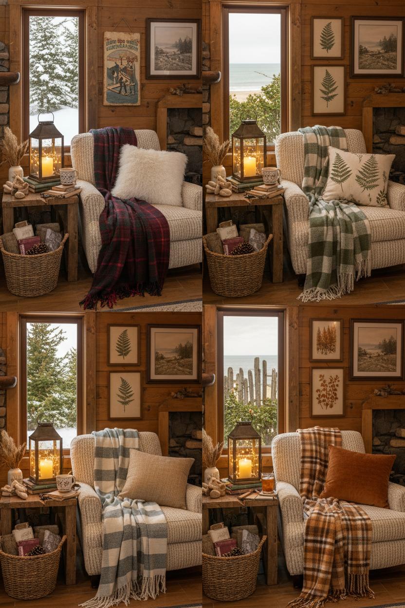 When the seasons shift outside your windows, let your nook follow suit with a few easy, feel-good swaps that keep the vibe fresh without redoing the whole room. Start with your textiles: a plaid throw blanket is the unsung hero of country cabin decor, instantly adding pattern, warmth, and a storybook sense of comfort to the corner. In winter, reach for deep cranberry or forest tartans and pair them with a chunky knit and a plush faux fur pillow for that extra layer of cozy cabin living. Spring invites lighter checks in moss, fern, and cream, while summer loves sun-washed neutrals and beachy blues that still feel farmhouse rustic but breezy. As autumn rolls in, return to those caramel and ember tones—draped casually over a chair, folded in a basket, or layered across the bench, they’re the simplest way to say “welcome in” to each new chapter of the year. And don’t overlook the glow: a rustic lantern by your reading spot makes every evening feel like a mini retreat.