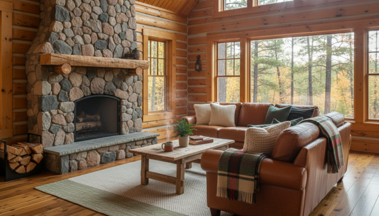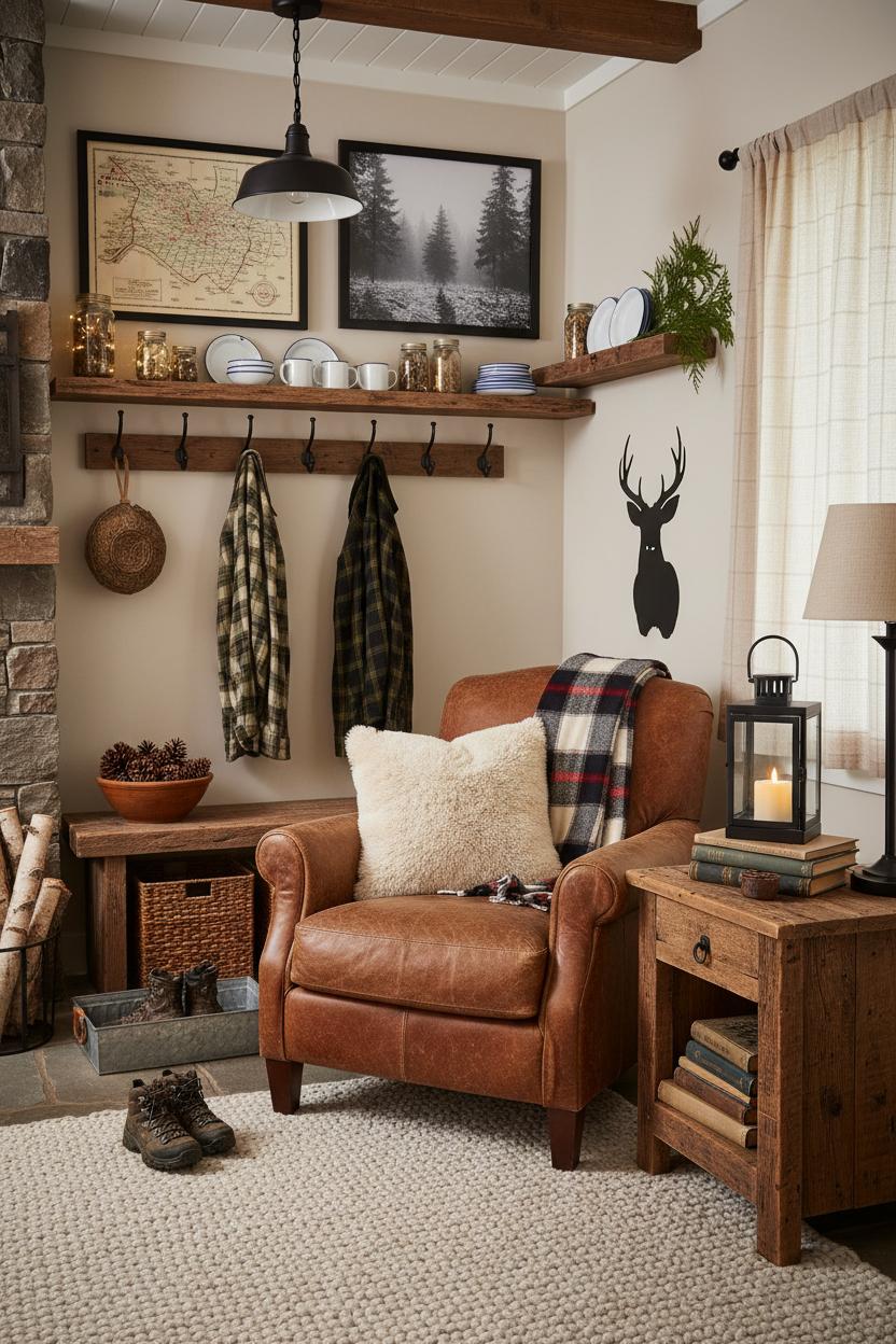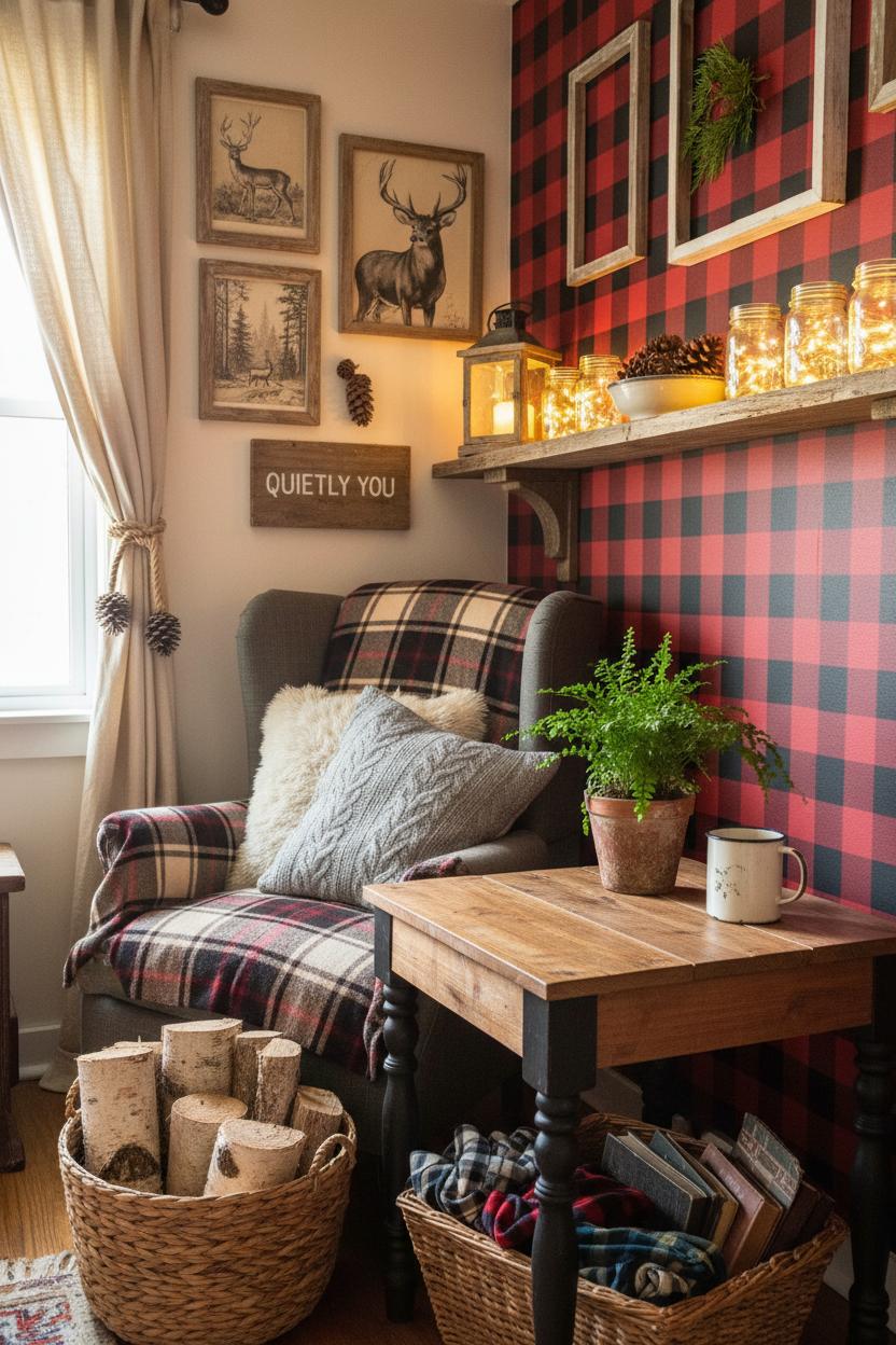 Slide into a snug retreat where country cabin decor meets farmhouse rustic charm. This cozy cabin living nook layers a plaid throw blanket, a faux fur pillow, and a reclaimed wood side table beside a flickering rustic lantern, while cabin wall art anchors the woodland home style. Explore effortless rustic cabin ideas you can steal today—warm textures, weathered woods, and nature-inspired accents that turn any corner into a storybook hideaway. Ready to nestle in? Let’s style a space that feels like a forever weekend in the woods.