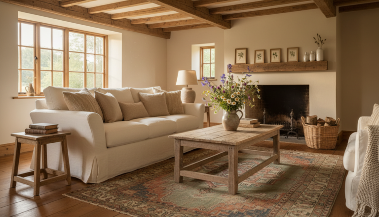 Across the home, the palette stays calm—creamy whites, oat and sand, soft grays—warmed up with natural wood and a few matte metals. Cozy textures do the heavy lifting: nubby knits tossed over a sofa, a stripe of ticking on a cushion, a jute rug underfoot. Greenery is the finishing touch; even a simple bundle of eucalyptus feels right at home. At its heart, country farmhouse decor is about creating spaces that feel collected over time, effortlessly useful, and always, wonderfully welcoming.