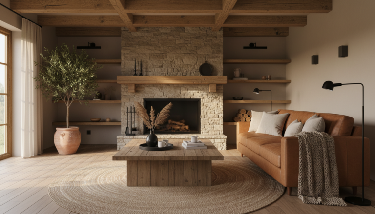 Think of country farmhouse decor as the soft glow of a porch light at dusk—welcoming, unfussy, and full of quiet character. It’s rooted in simple living and honest materials: weathered wood, linen, stone, iron, and timeworn finishes that celebrate the perfectly imperfect. Rather than chasing trends, this style leans into the warmth of rustic home decor—layers of neutral tones, cozy textures, and pieces that tell a story. It’s the everyday beauty of fresh bread set on a galvanized metal tray, wild branches tucked into a ceramic pitcher vase, and the gentle contrast of shiplap wallpaper adding subtle texture behind a favorite chair. You’ll find function and charm in equal measure—reclaimed wood shelves that actually hold your essentials, baskets that corral the mess, and lighting that casts a soft, lived-in glow.