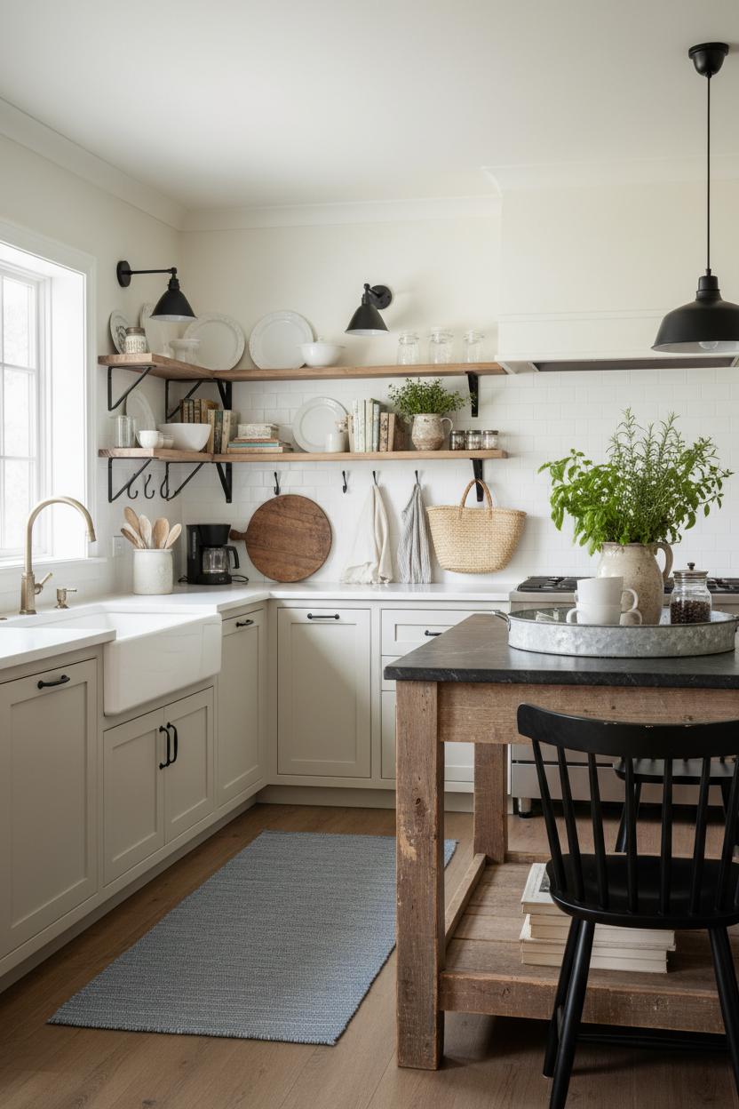 For small-space farmhouse kitchen ideas, trade bulky cabinets for a mix of closed storage and airy display. A pot rail frees up drawers, and a couple of reclaimed wood shelves offer a pretty perch for everyday dishes. Create a coffee or tea station on a galvanized metal tray, then stash mugs and filters beneath to keep counters clear. A drop-leaf table or bistro set doubles as prep space and dining, and textured runners soften hard floors. Keep accessories functional—wood boards, linen towels, a ceramic pitcher vase as a utensil crock—so every piece earns its keep. Finish with leafy greens, matte black hardware, and cozy lighting to bring country farmhouse decor home, even when square footage is scarce.