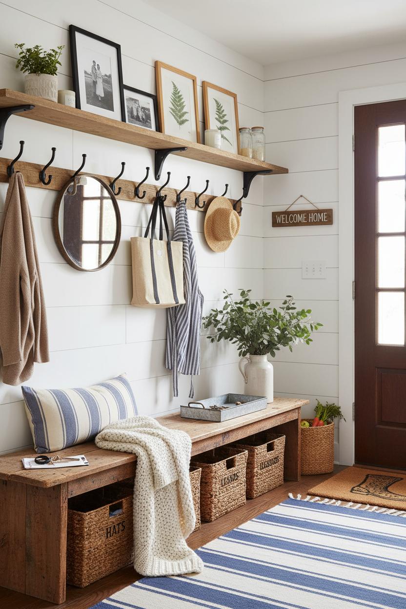 For a welcoming farmhouse entryway, mix everyday function with a collected feel. A sturdy bench with baskets tucked below invites shoes to disappear, while a slim console topped with a small lamp sets a cozy glow. Add personality with a narrow runner, a handful of peg hooks for market bags and straw hats, and a petite arrangement—eucalyptus or wildflowers—in a ceramic pitcher vase for a soft, lived-in touch. If your walls need texture, a single accent of shiplap wallpaper behind the hooks adds subtle dimension, and a simple mirror helps bounce light. The secret is restraint: choose a cohesive palette, edit often, and let a few well-loved pieces carry the charm so the whole home feels calm, curated, and effortlessly blended.