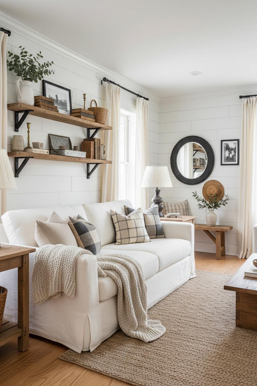 Start by giving your living room a soft, storybook backdrop with shiplap wallpaper—peel-and-stick if you want a quick, renter-friendly refresh. The subtle planked lines instantly bring that cozy, country farmhouse decor vibe without the sawdust, and they play beautifully with creamy whites, warm woods, and matte black accents. Think of the walls as a calm canvas that lets textures do the talking: linen curtains that puddle just so, a nubby jute rug underfoot, and a slipcovered sofa layered with chunky knits. This is modern farmhouse style at its most livable—clean and airy, but grounded with character—so the room feels equal parts bright and nostalgic, like a Sunday afternoon that never quite ends. It’s the simplest way to fold rustic home decor into your everyday, with a look that feels collected rather than contrived.