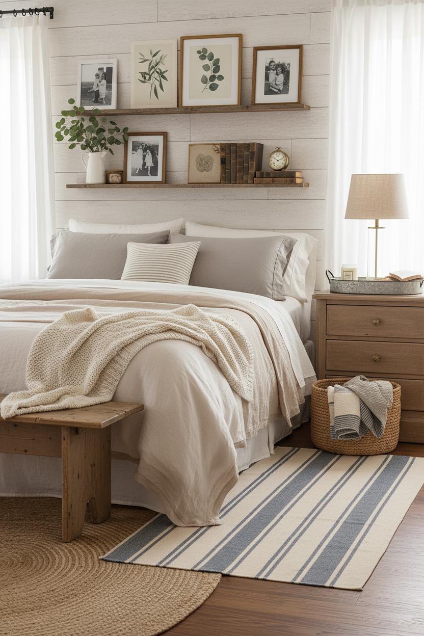 When you’re dreaming up a true bedroom retreat, start with layers of softness in a calm, neutral palette that feels collected over time. Think stone-washed linen sheets, a chunky knit throw puddled at the end of the bed, and a pair of vintage-inspired ticking pillows for that whisper of pattern without the noise. Keep the tones restful—creamy whites, warm oatmeal, a touch of greige or soft charcoal—so the textures do the talking. This is where country farmhouse decor really shines: simple, tactile pieces that invite you to slow down. Add a jute underlay with a faded cotton rug on top, let the light filter through gauzy curtains, and tuck a woven basket beside the bed for extra quilts. The result is rustic home decor with an airy, modern farmhouse style finish—snug, unfussy, and endlessly livable.